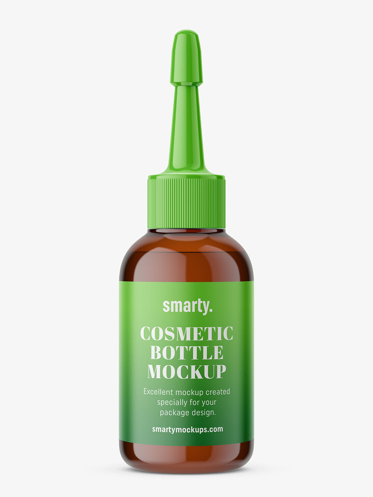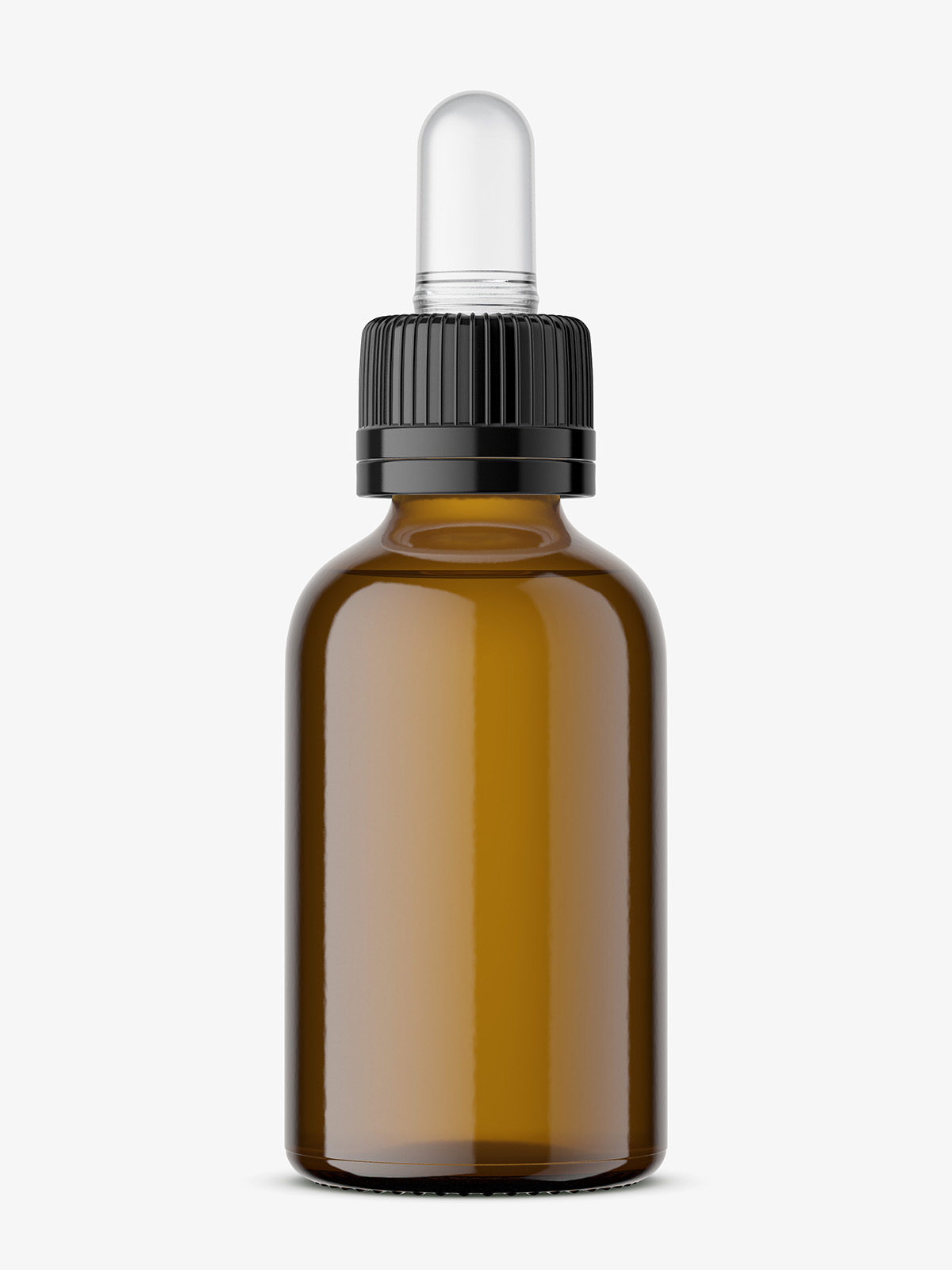 Amber dropper bottle mockup filled with colorless liquid. It`s color can be changed as well as colors of the cap and dropper.