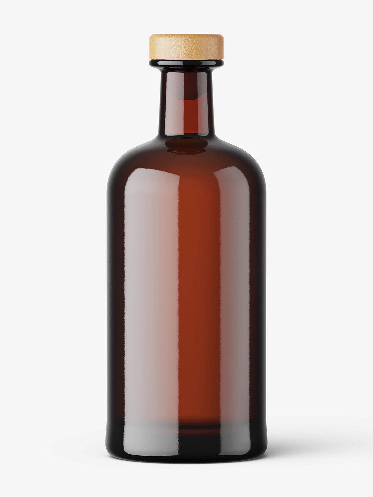 Amber vodka bottle with transparent liquid inside. Such mockup may be use as vodka packaging packshot or other alcohol drinks as well.