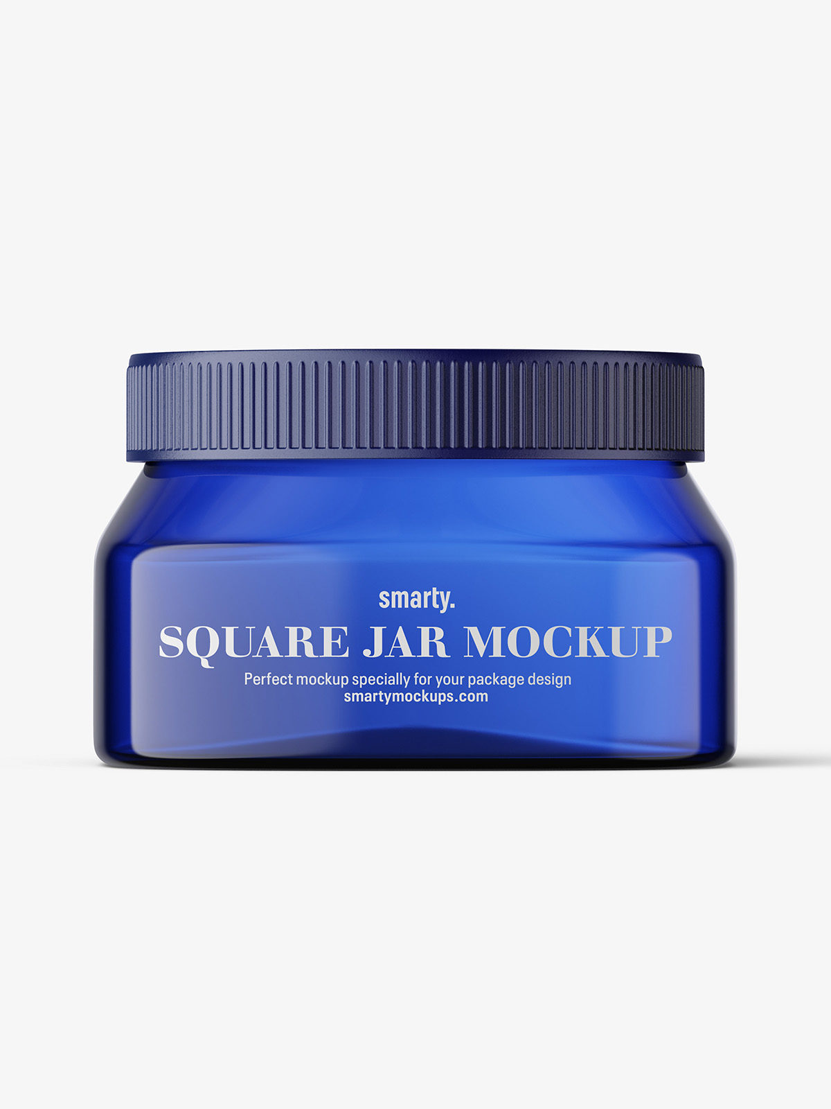 Blue square base jar mockup prepared in high resolution. Prepared with ability to paste project and set cap color. Label covers entire jar.