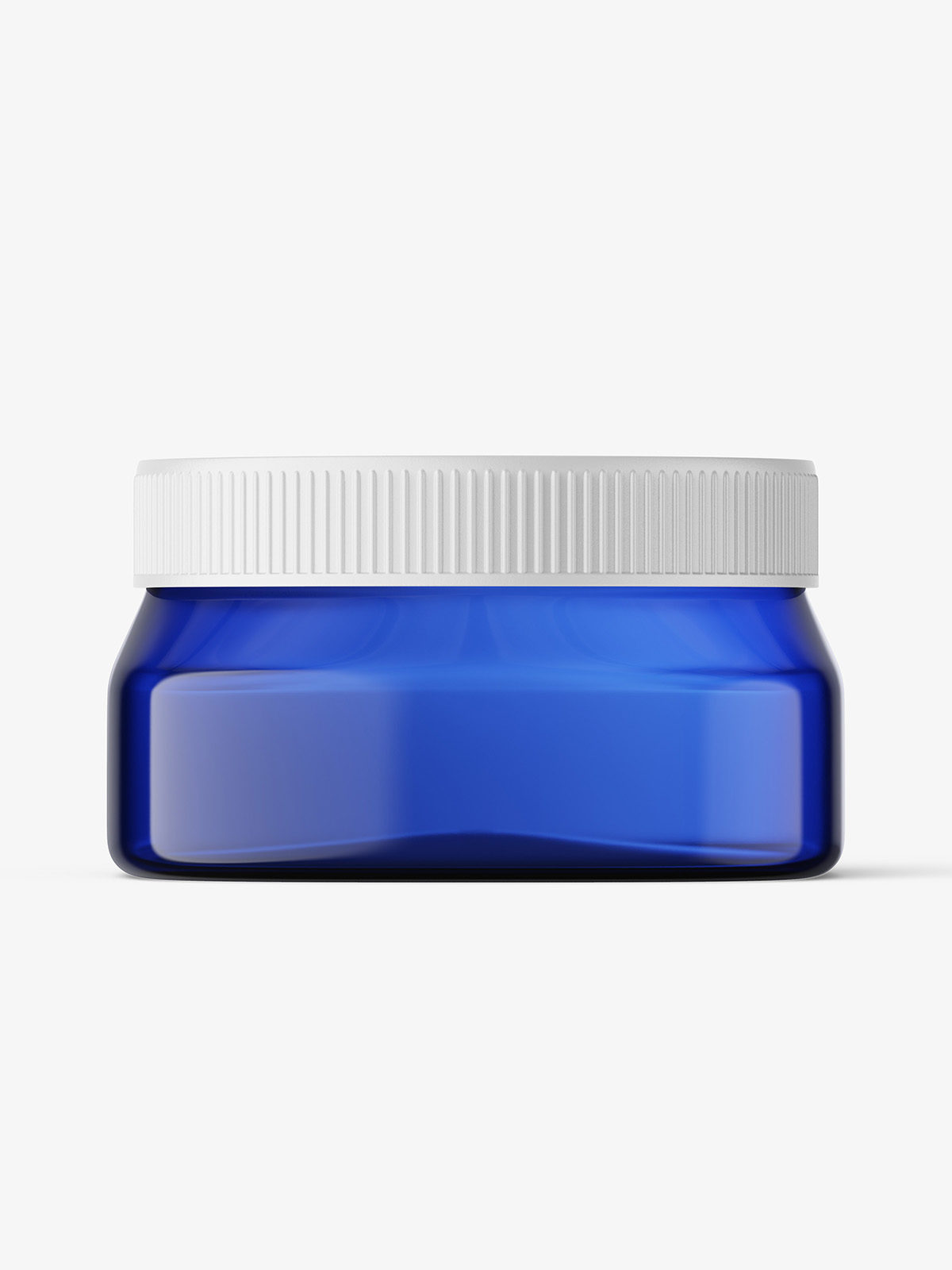 Blue square base jar mockup prepared in high resolution. Prepared with ability to paste project and set cap color. Label covers entire jar.