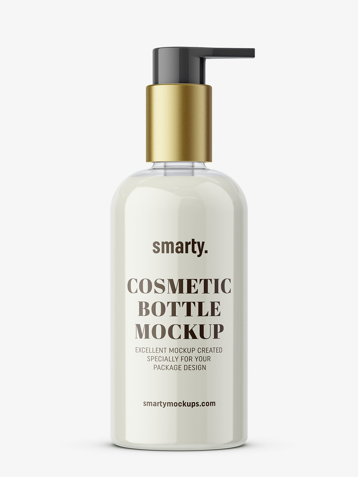 Bottle with simple elegant pump mockup. Such bottle may be used as shampoo, liquid soap or other creams packaging. Very easy to customize.