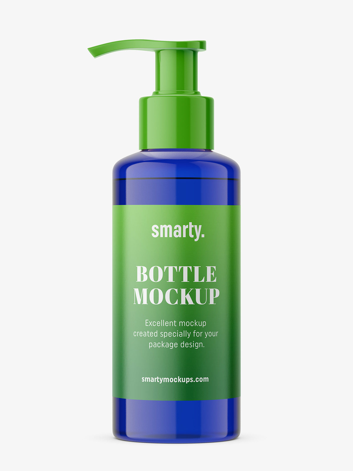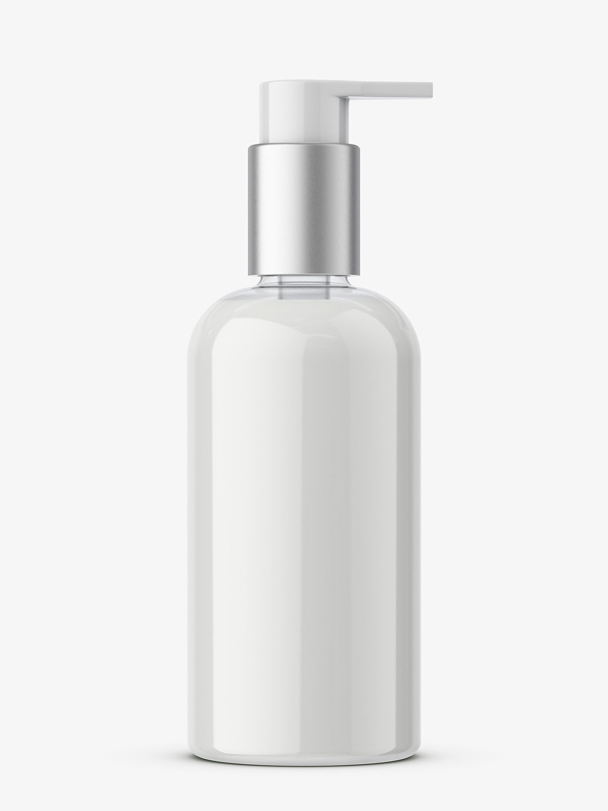 Bottle with simple elegant pump mockup. Such bottle may be used as shampoo, liquid soap or other creams packaging. Very easy to customize.