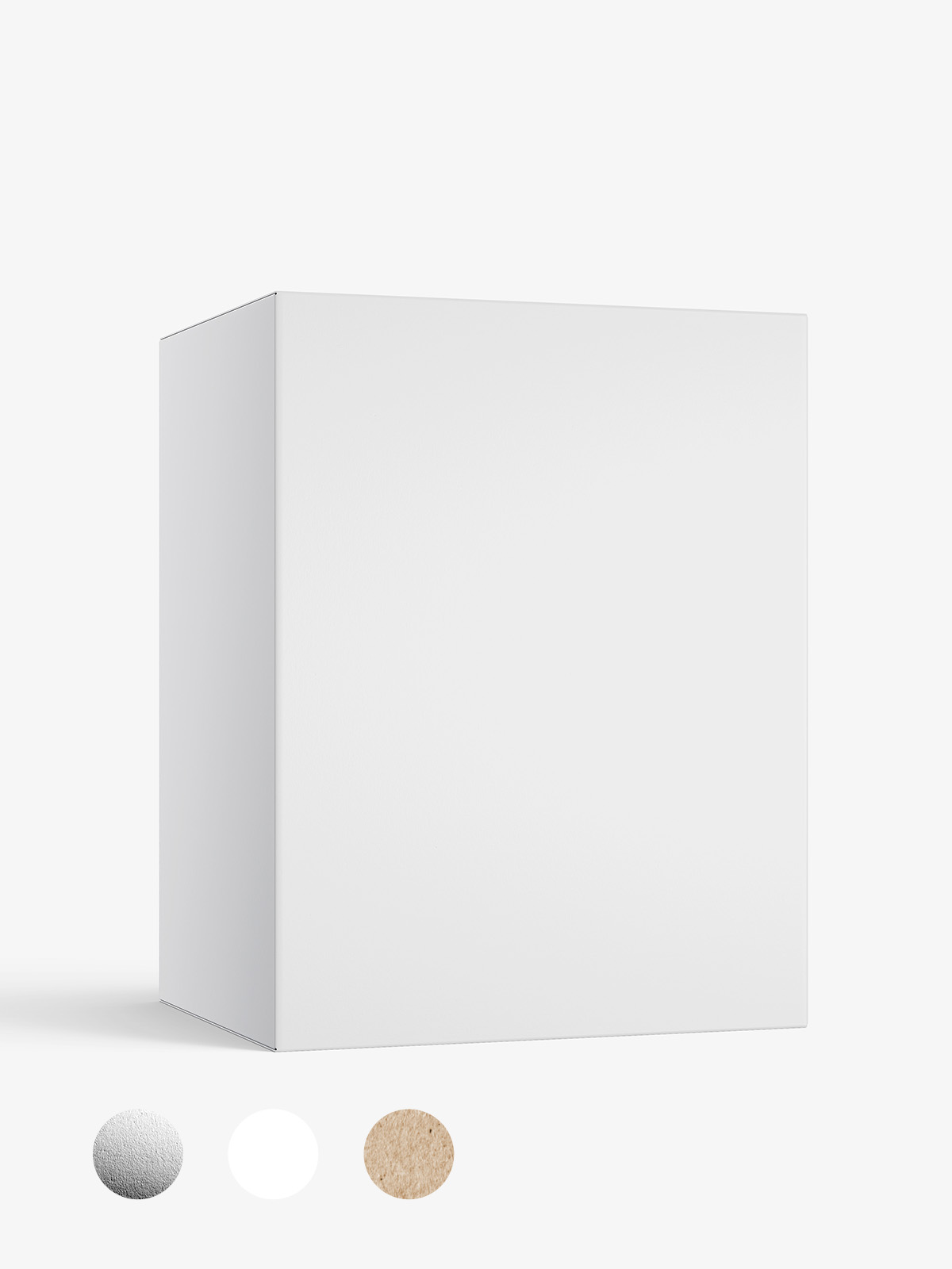 Realistic frontal box mockup prepared in high resolution. Mockup is prepared with three coatings: white, metallic and kraft paper. White paper can be mixed with metallic.