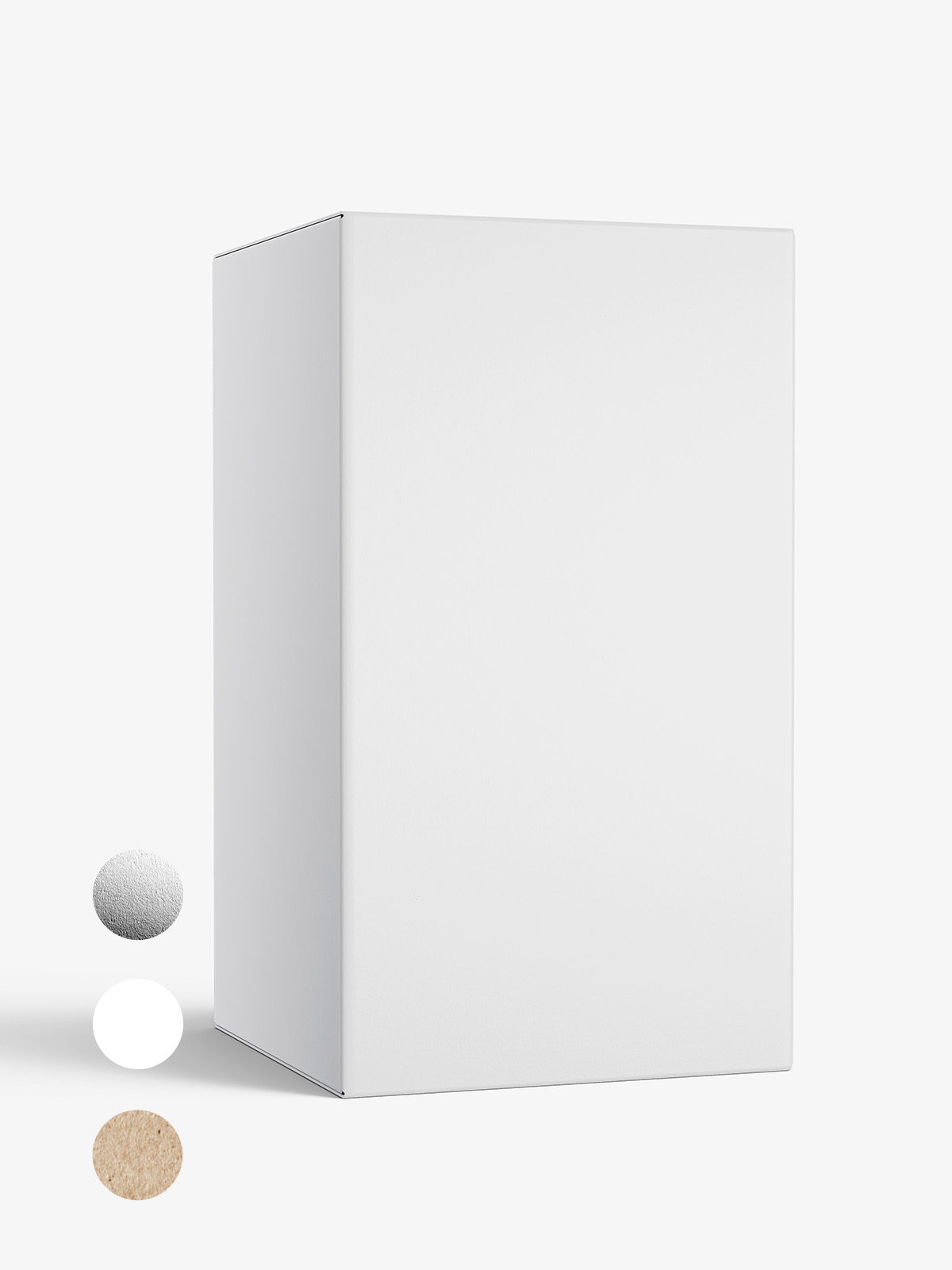 Realistic frontal box mockup prepared in high resolution. Mockup is prepared with three coatings: white, metallic and kraft paper. White paper can be mixed with metallic.