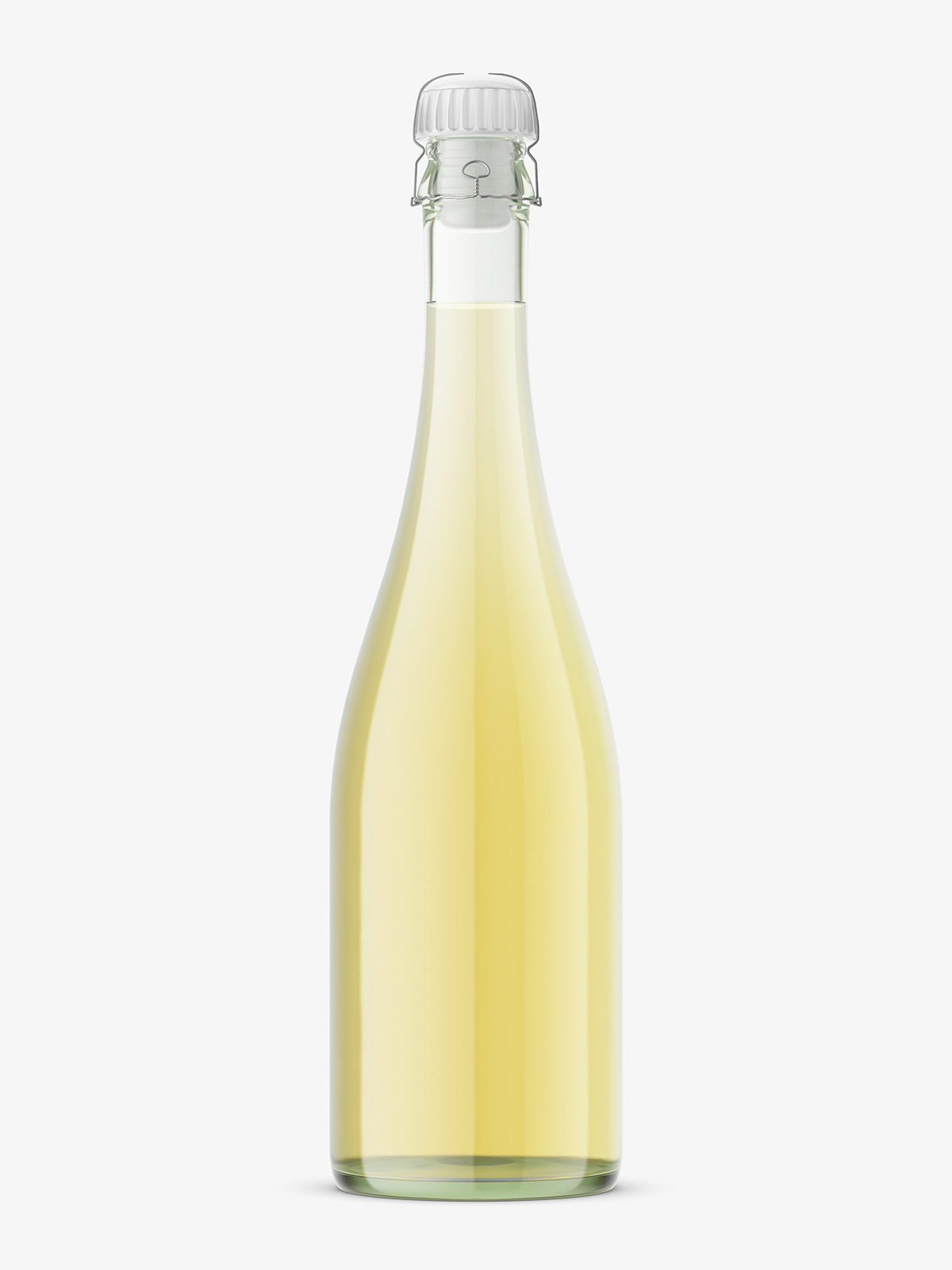 Realistic champagne bottle prepared with three separate labels. Each is covered by different paper type: embossed, matt and metallic. Labels covers entire bottle.