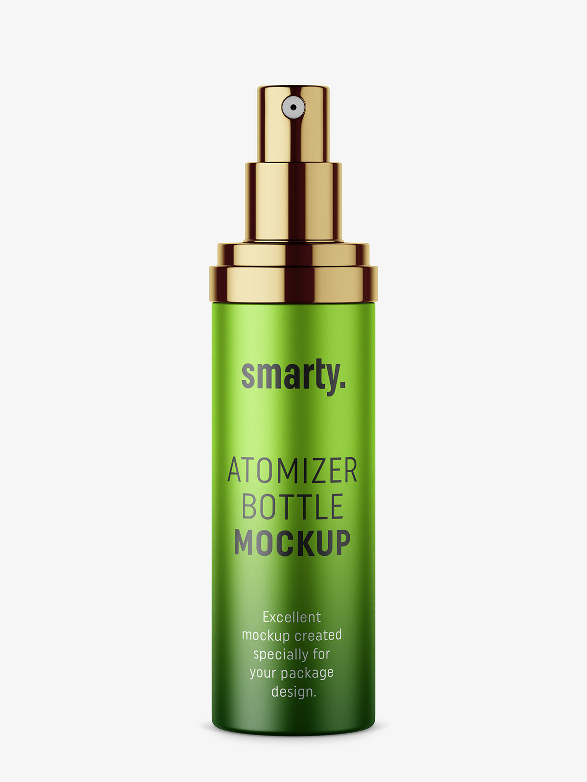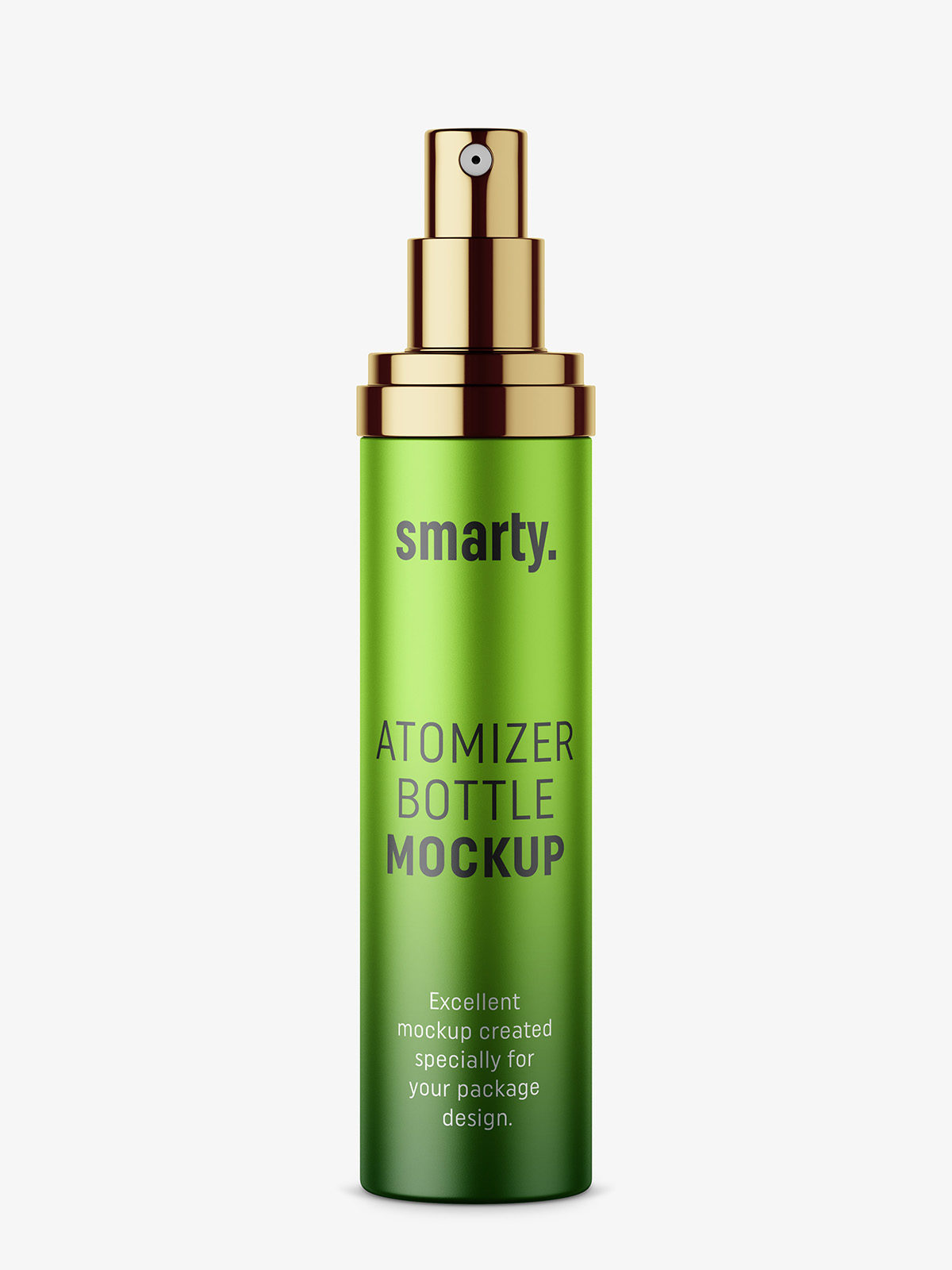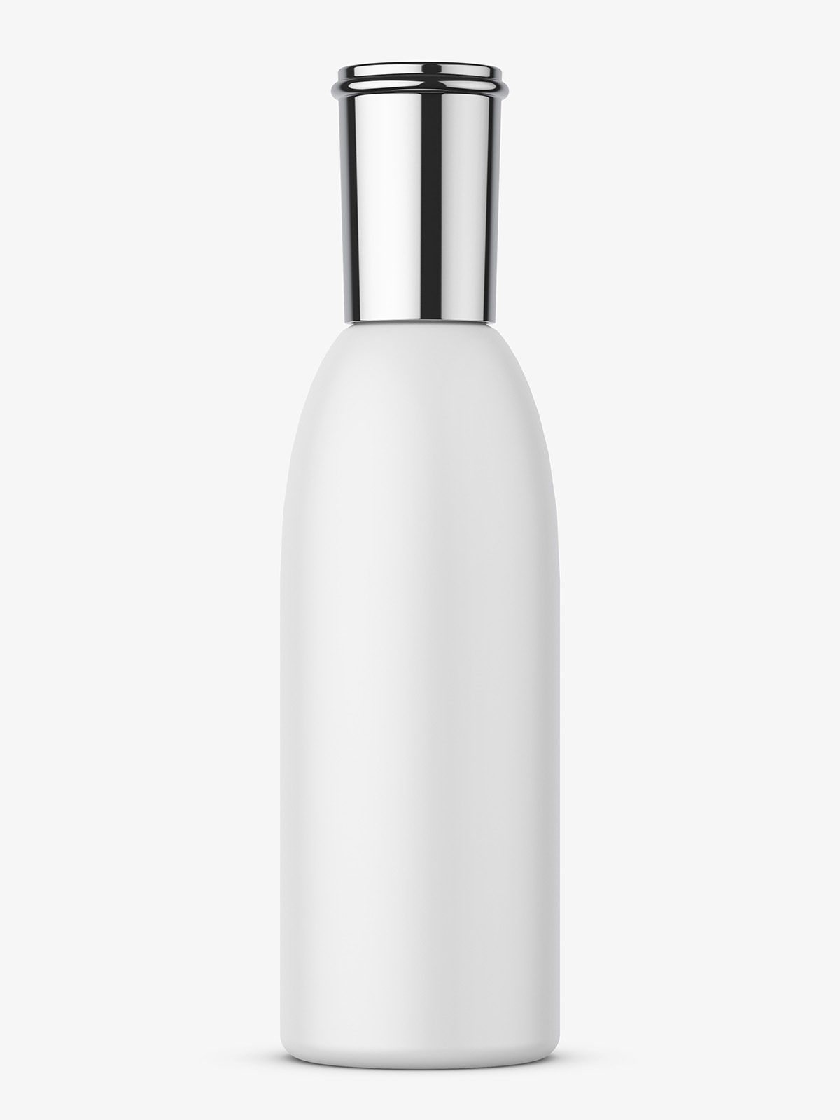 Cosmetic bottle with metallic cap mockup prepared with ability to paste project and set cap color. Layer with Smart Object covers entire bottle.