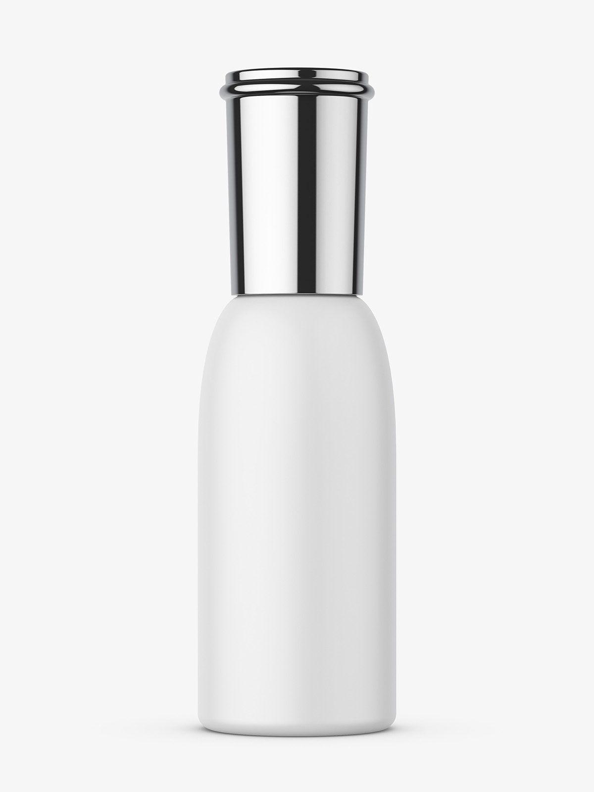 Cosmetic bottle with metallic cap mockup prepared with ability to paste project and set cap color. Layer with Smart Object covers entire bottle.