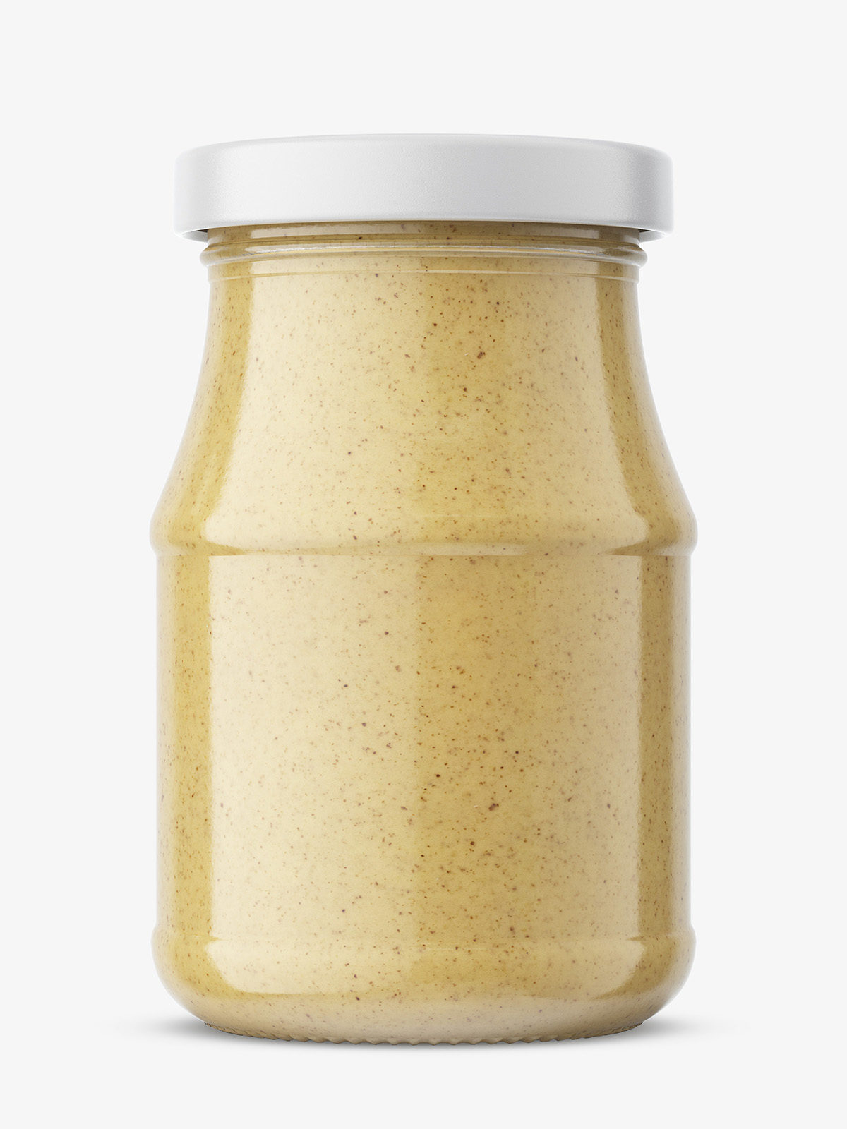 Popular glass jar filled with mustard or other similar cream. Mockup prepared with an option for an easy change of the cap and label project. Inside of the jar cannton be replaced.