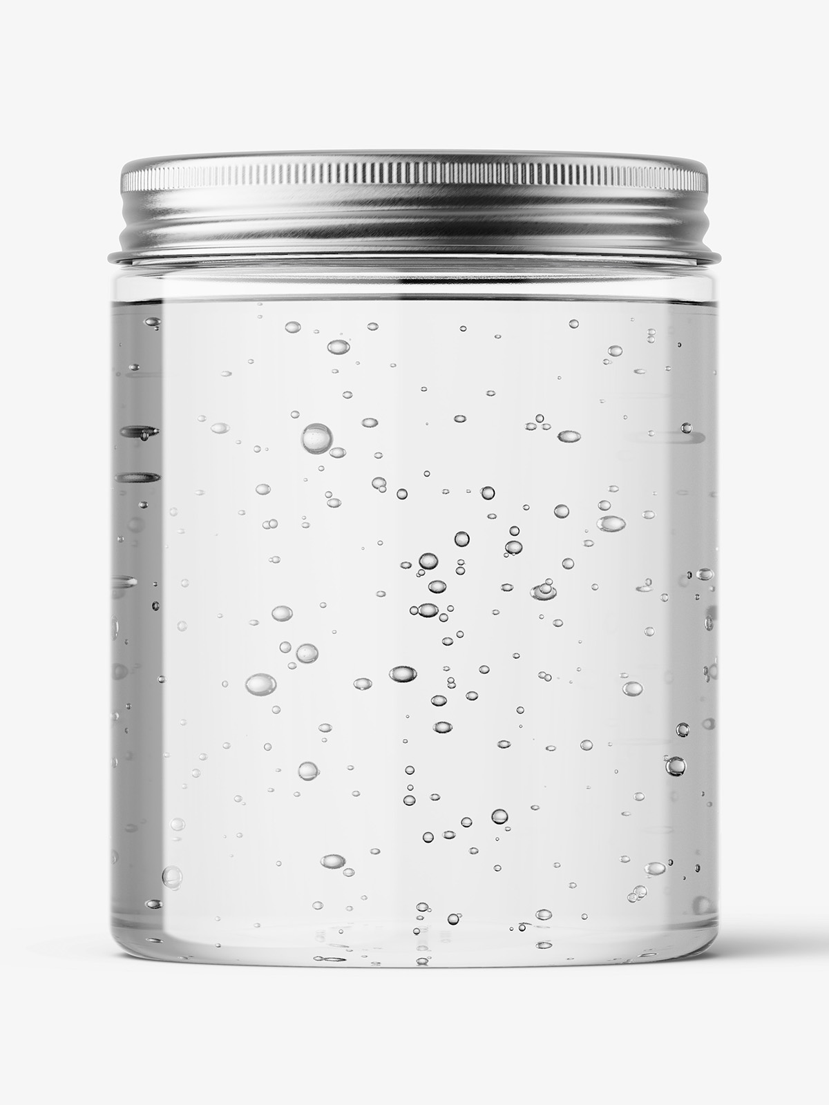 Transparent jar filled with liquid gel mockup. Mockup is prepared in high resolution, you can change gel and cap color. Label covers entire jar.