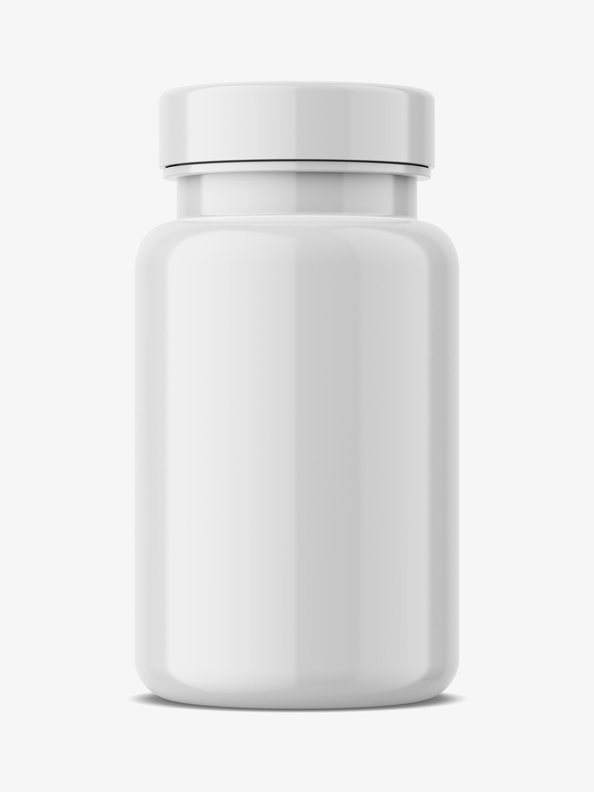 Glosy pharmacy jar mockup, used in the pharmaceutical industry as the package for tablets, pills, or capsules. The mockup was prepared so as to allow for adding any color to the cap.