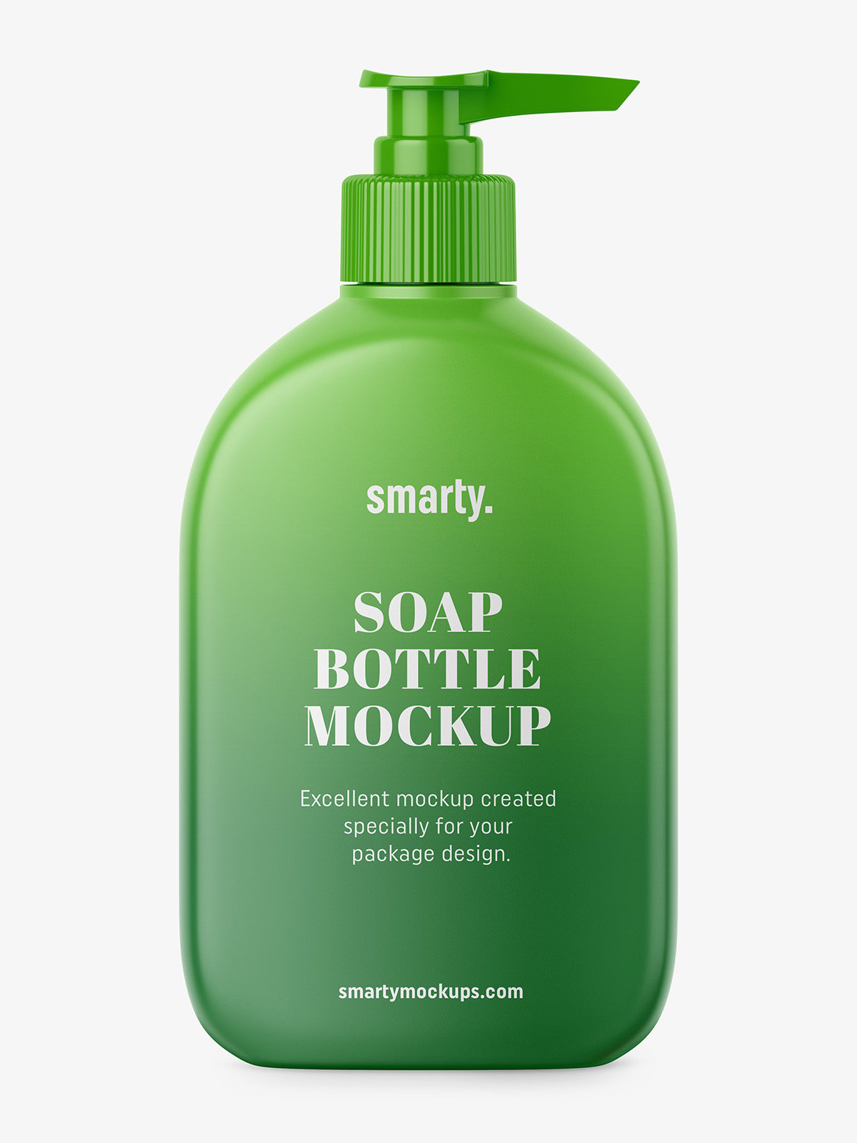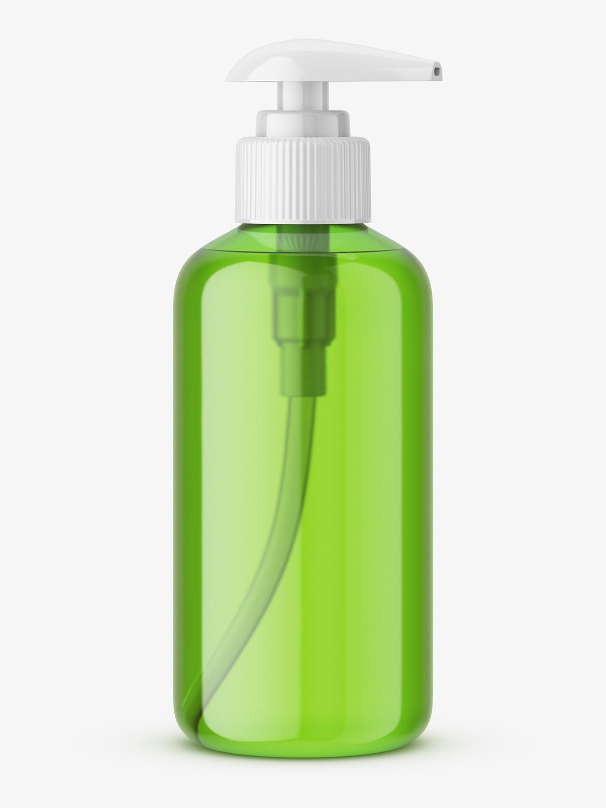 Green soap plasti bottle with pump mockup. Such packaging may be container for other liquids (ie. shampoos, gels, creams) as well, but soap in such bottle are quite often.