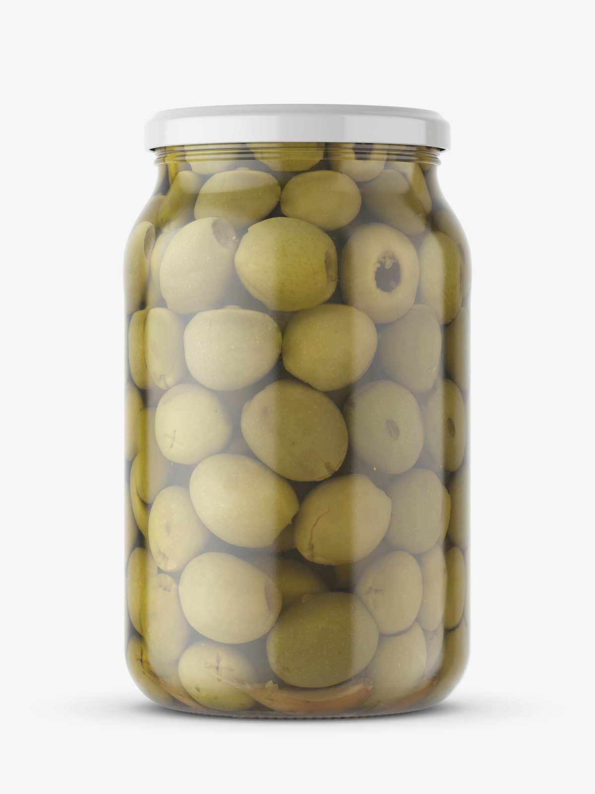 Realistic large jar of olives mockup prepared in high resolution. Label cover entire jar and can be easily change.