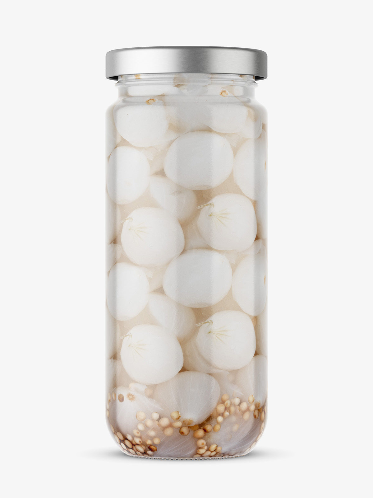 Marinated onions jar mockup. You can change label project and shape, as well as project of the metallic cap. Each layer has it’s own highlight layer.