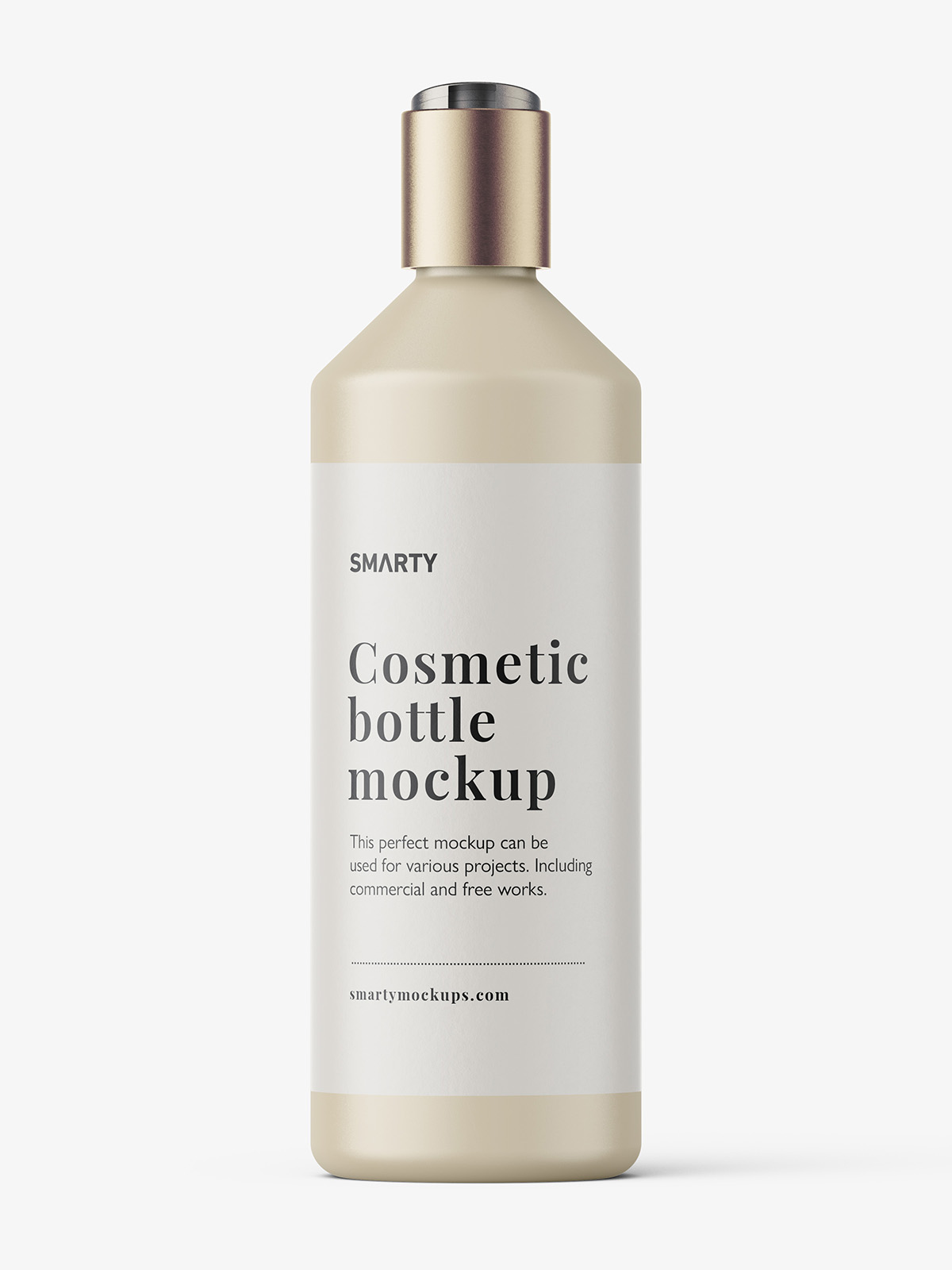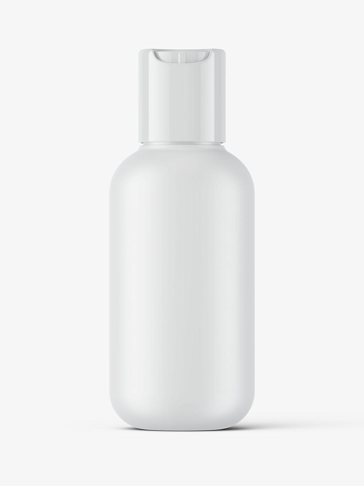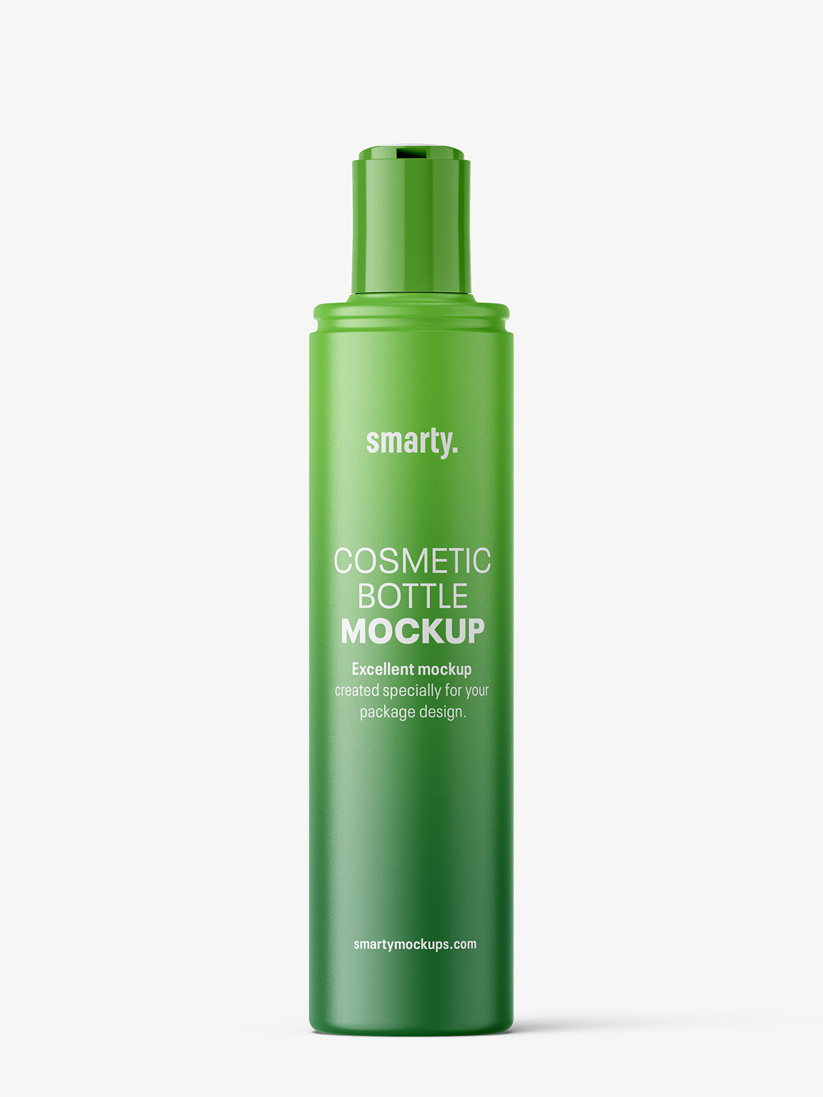 Easy to use cosmetic bottle with disc top lid mockup. Thanks to the fact that you can adjust every element of the bottle to your needs, you can create a beautiful and convincing visualization of your design in just a few moments.