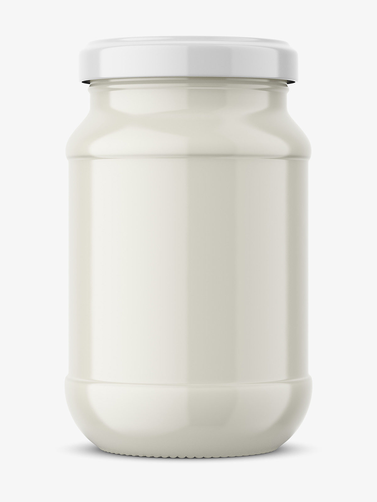 Popular glass jar filled with mayonnaise or other similar cream. Mockup prepared with an option for an easy change of the cap and label project.