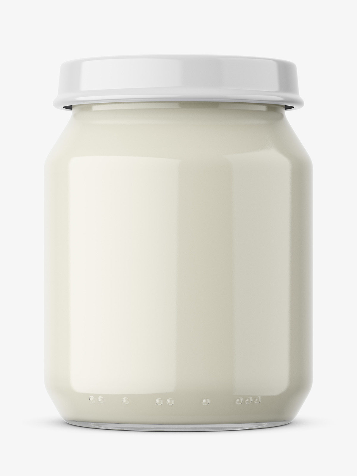 Popular glass jar filled with mayonnaise or other similar cream. Mockup prepared with an option for an easy change of the cap and label project.