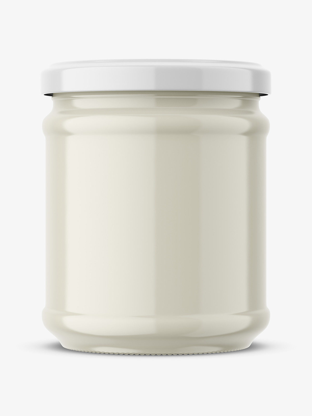 Popular glass jar filled with mayonnaise or other similar cream. Mockup prepared with an option for an easy change of the cap and label project.