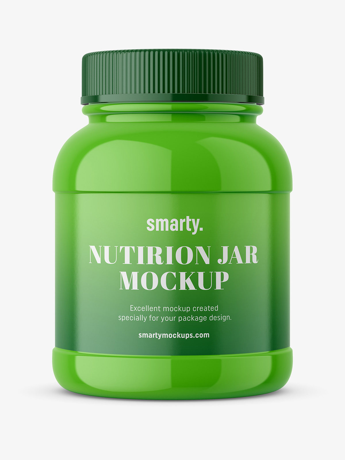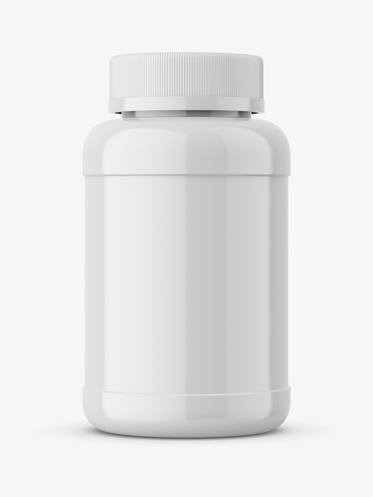 Nutrition bottle, used in the pharmaceutical industry as the package for tablets, pills, or capsules. The mockup was prepared so as to allow for adding any color to the cap.