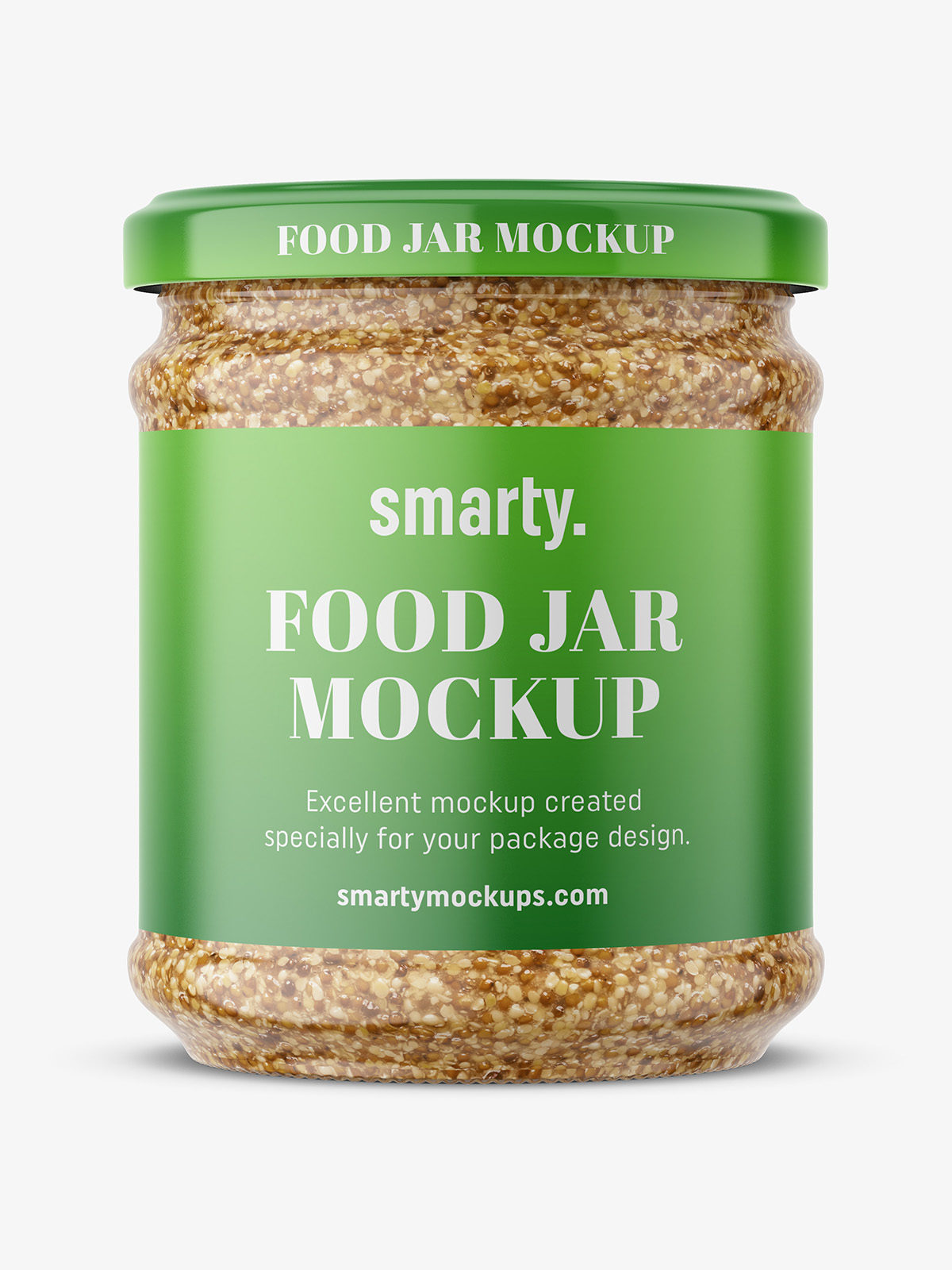Popular glass jar filled with old style mustard or other similar cream. Mockup prepared with an option for an easy change of the cap and label project.