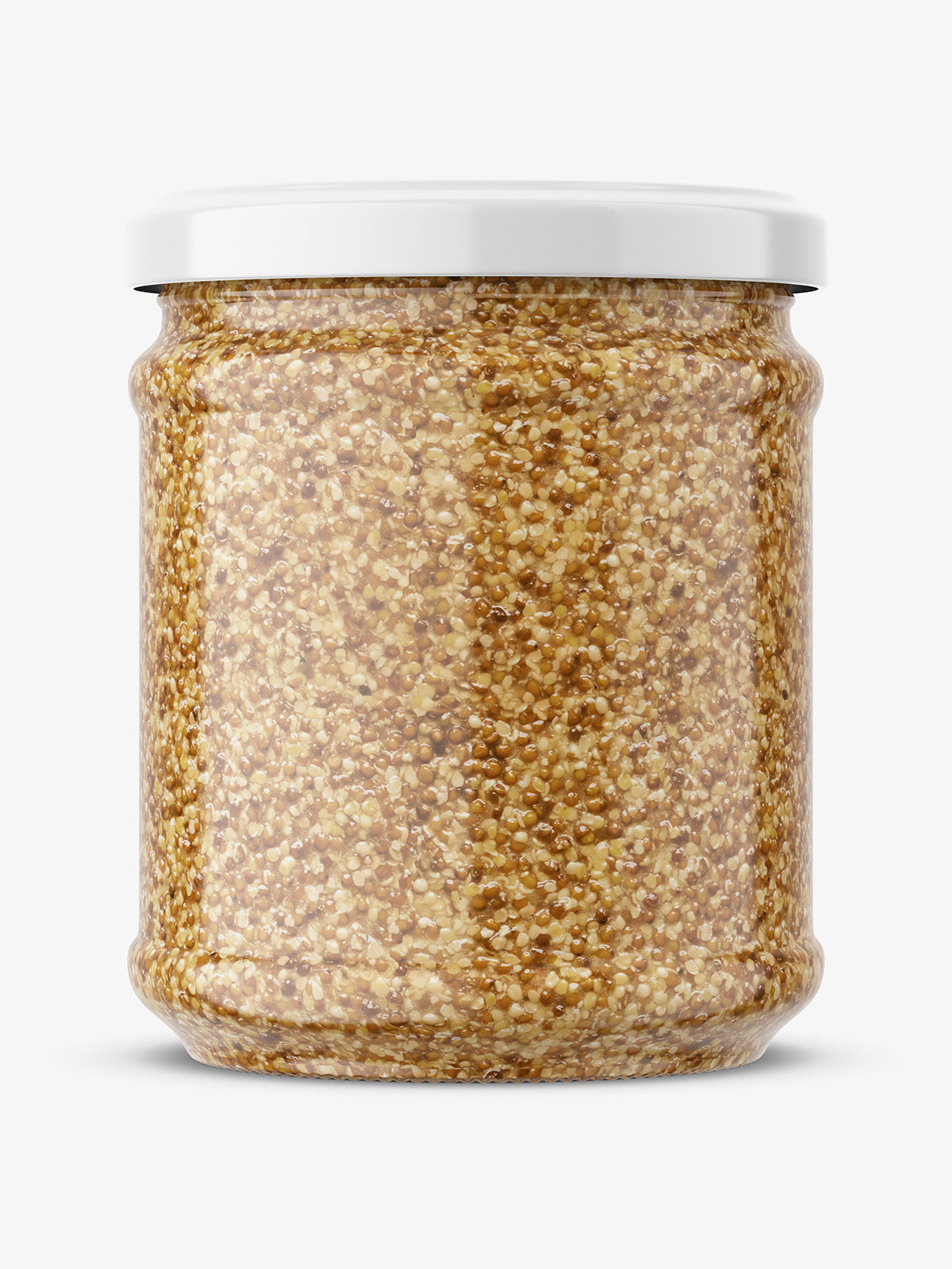 Popular glass jar filled with old style mustard or other similar cream. Mockup prepared with an option for an easy change of the cap and label project.