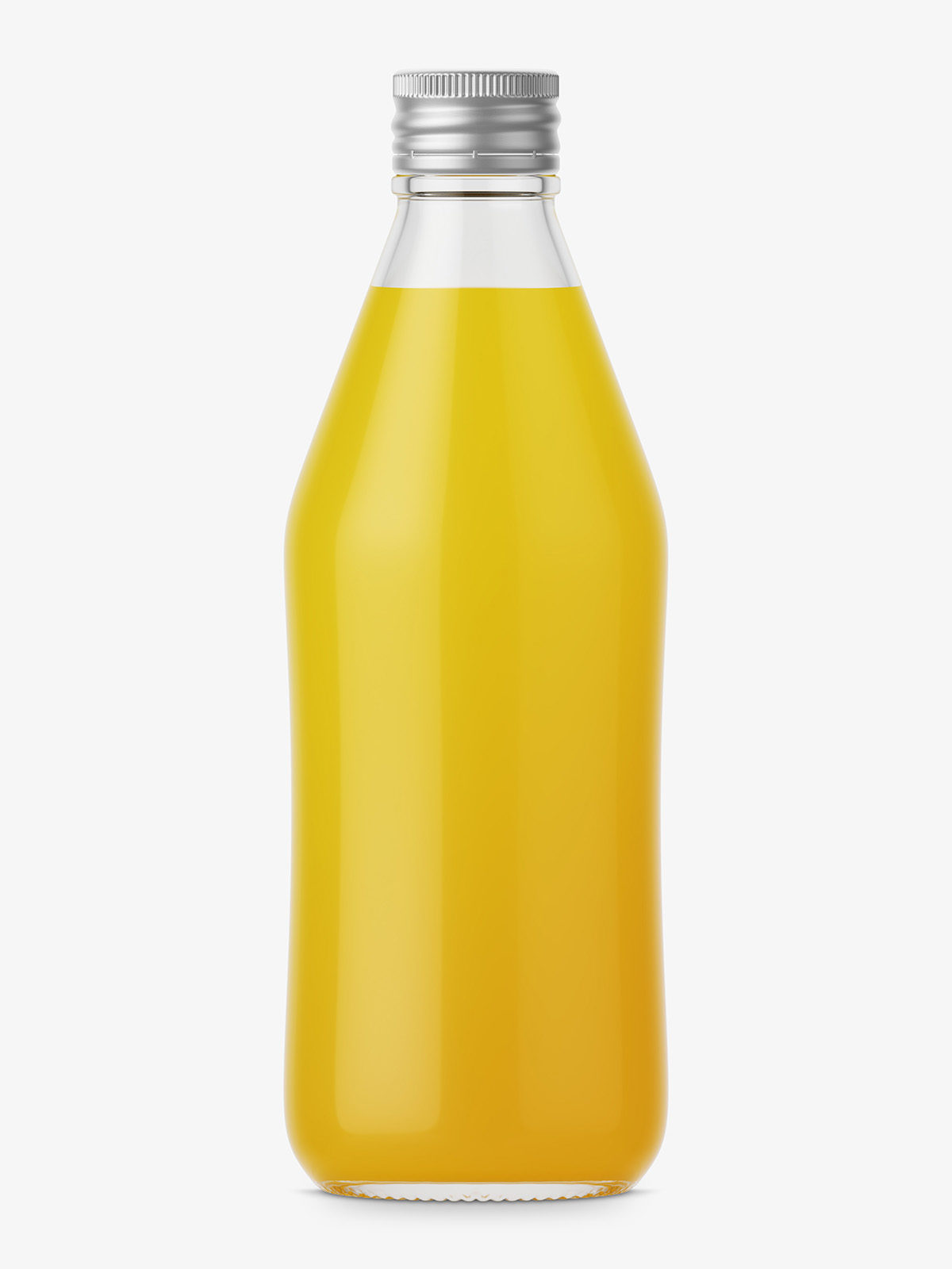 Regular glass bottle with orange juice. Bottle has silver cap, and its color can be changed. Organised and colourized layer setup makes easy to customize this mockup.