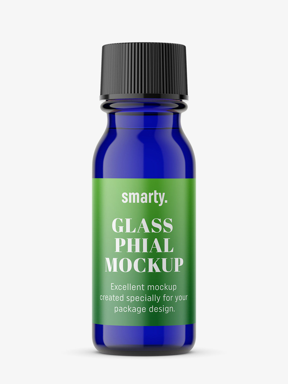 Pharmaceutical glass (phial) bottle used as packaging for medical or cosmetic products. Mockup prepared with an option for an easy change of the cap color.