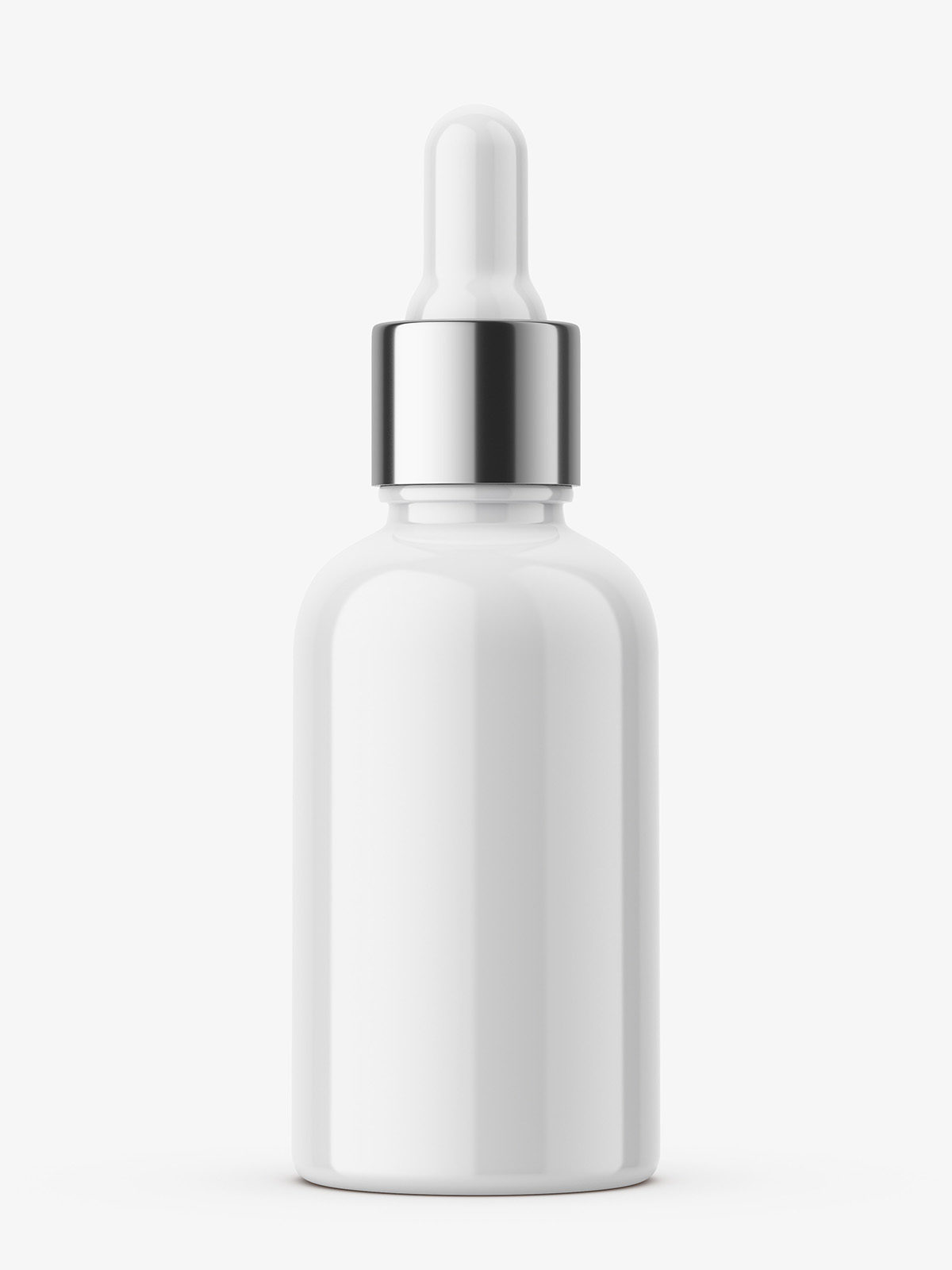 Glossy plastic bottle with silver cap and matt dropper. Such bottles are used in pharmacy and cosmetic industry.
