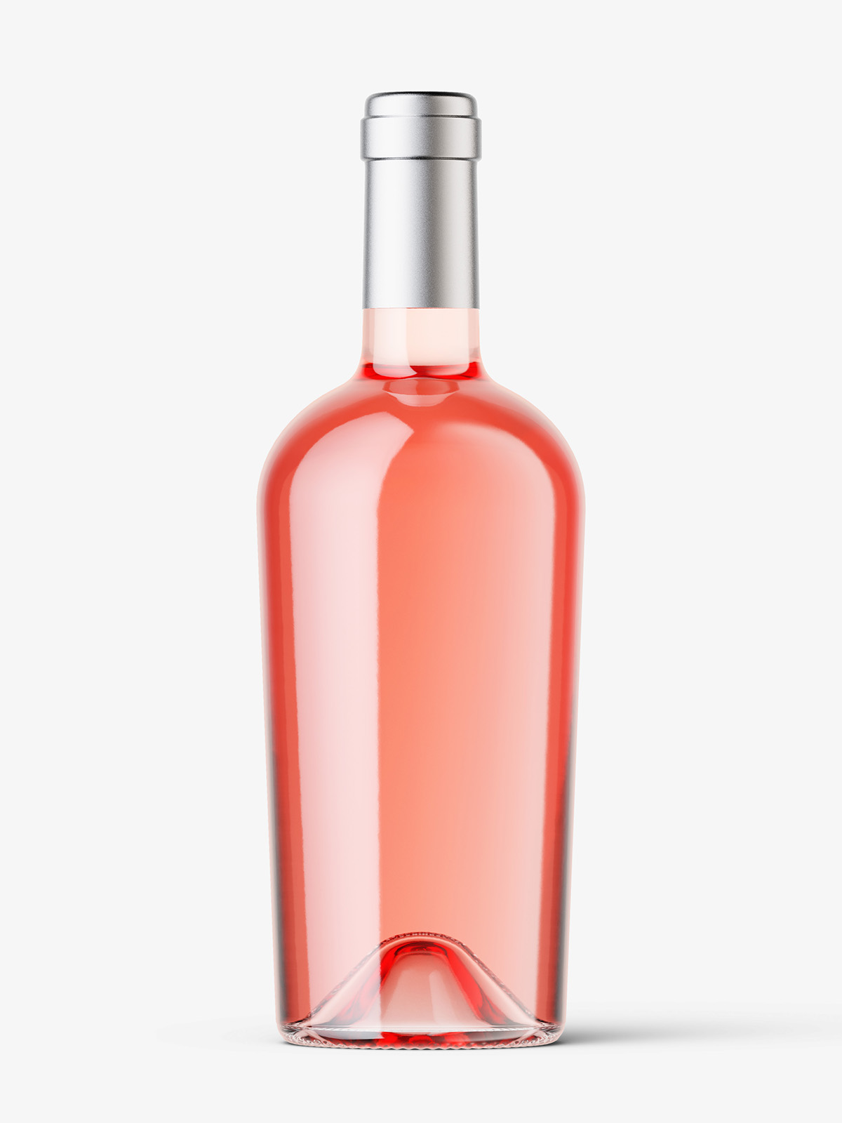 Rose wine bottle mockup prepared in high resolution. Hot stamping (with customizable color) coating is available for label. Two caps type: paper and metallic screw cap.