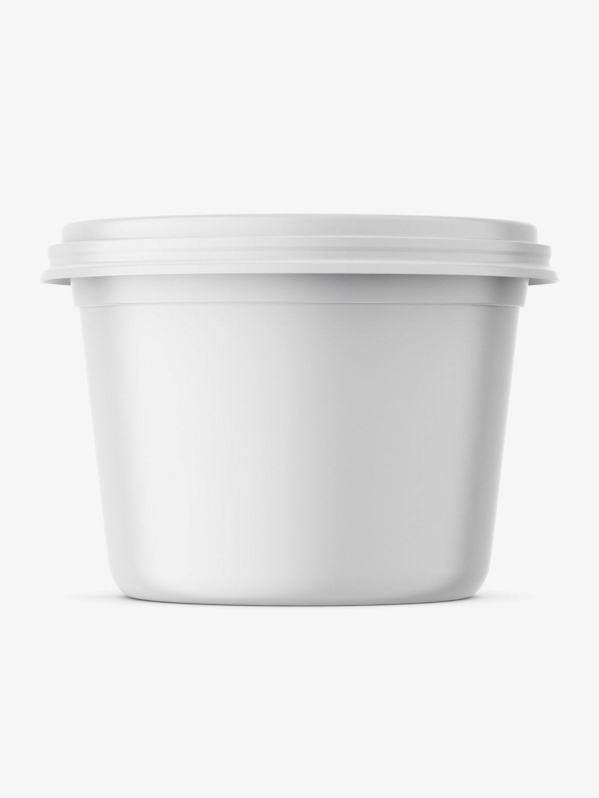 Plastic tub / bucket used as a container for various creams: sour cream, cottage cheese, yoghurt and others. The mockup was prepared for an easy change of packaging color.