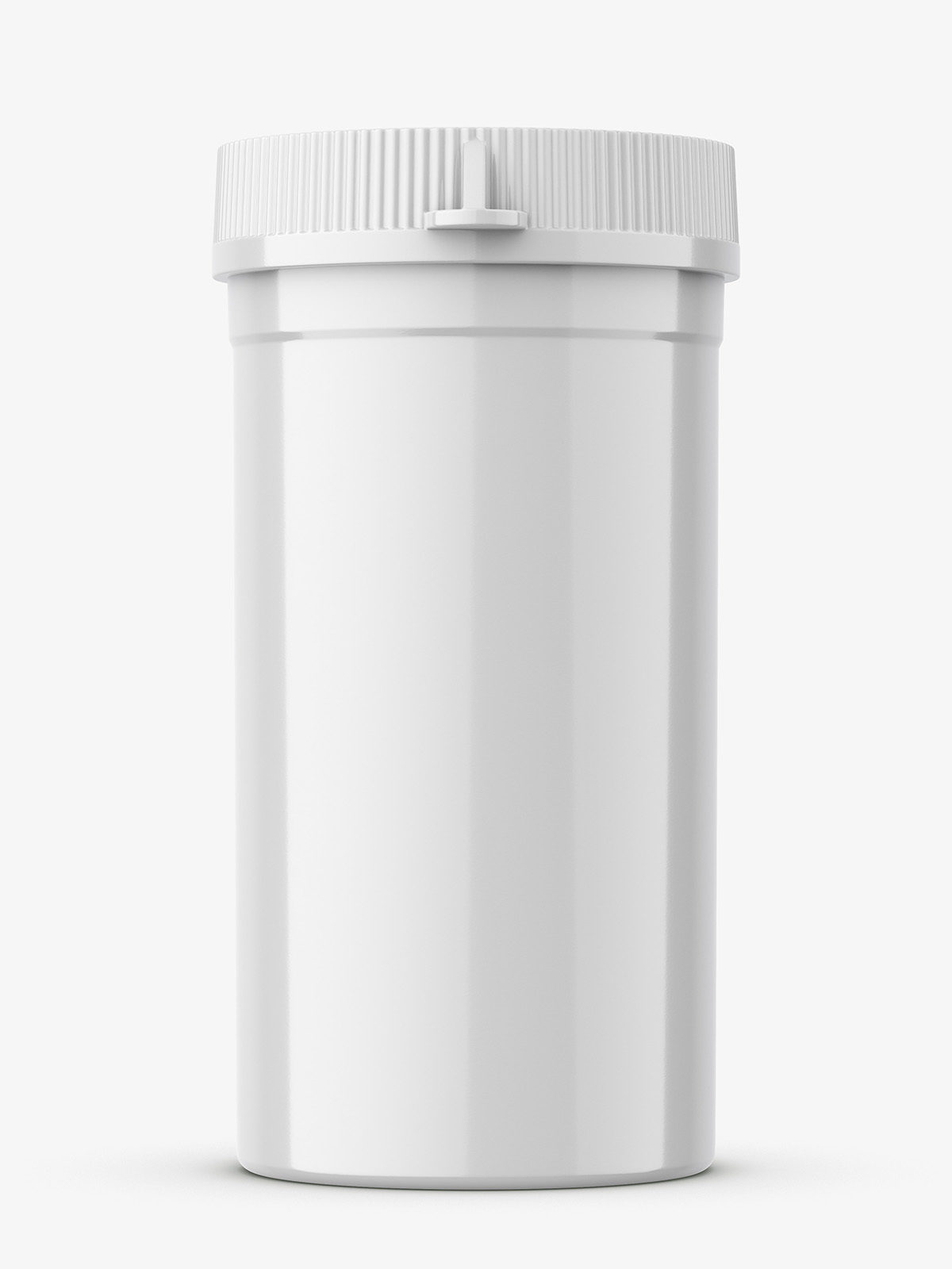 Tiny plastic jar often used as container for pills or tablets. Such bottle my be used as a sample or trial packaging.