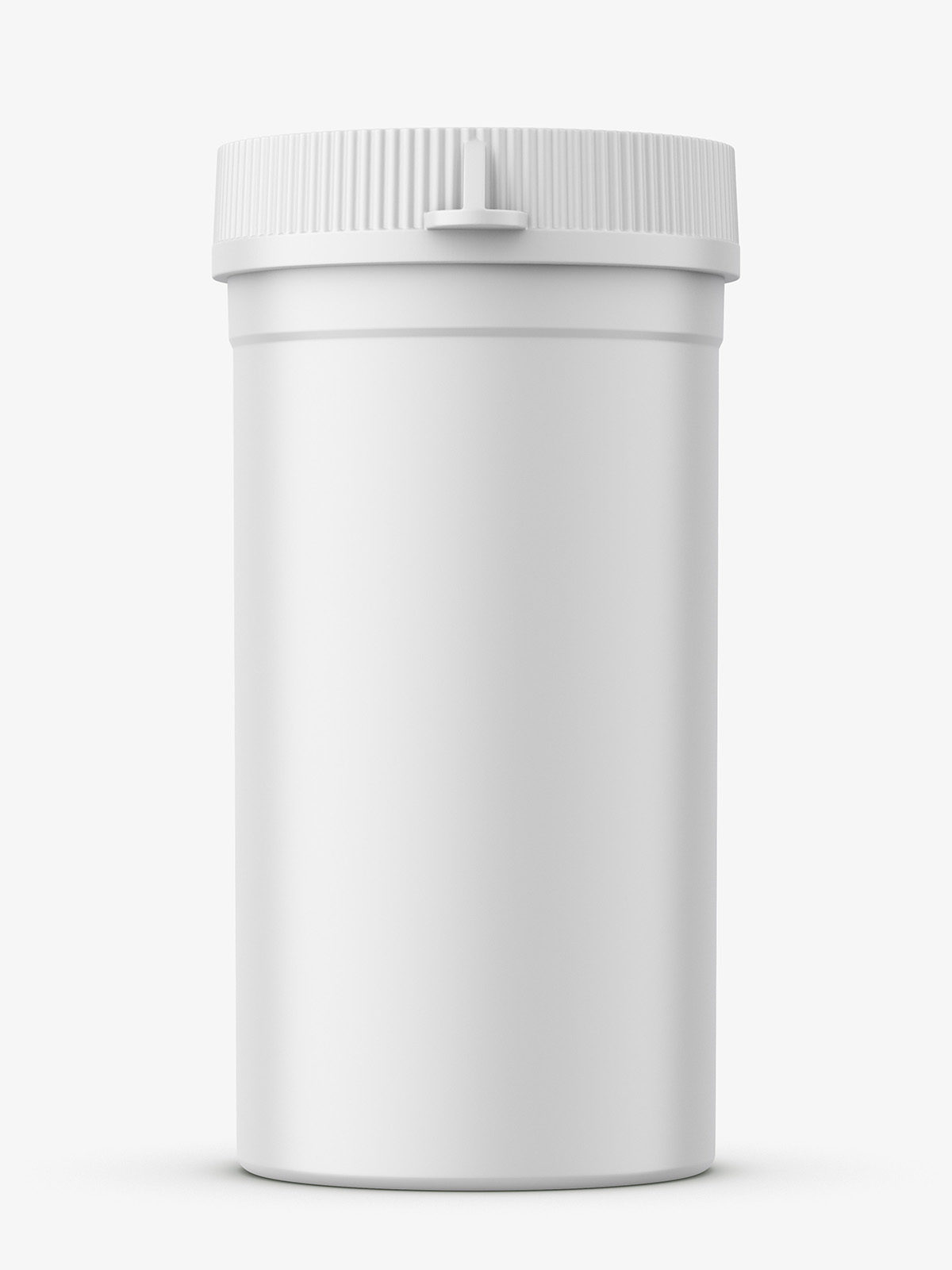 Tiny plastic jar often used as container for pills or tablets. Such bottle my be used as a sample or trial packaging.