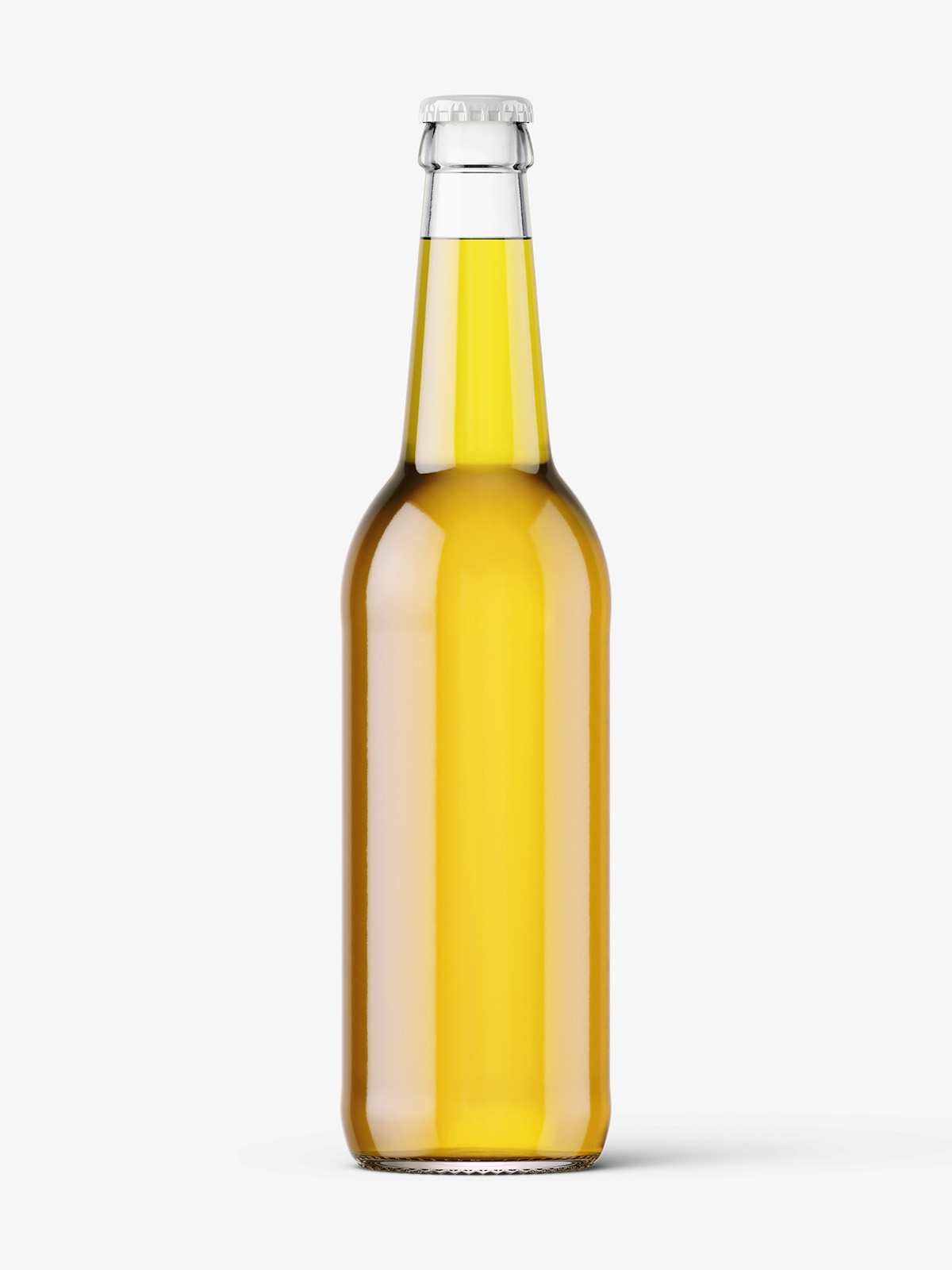 Transparent beer bottle mockup prepared to edit paper and metallic label. Every element has it’s own light layer that can be customized. Layer with waxed seal can be turn on and off.