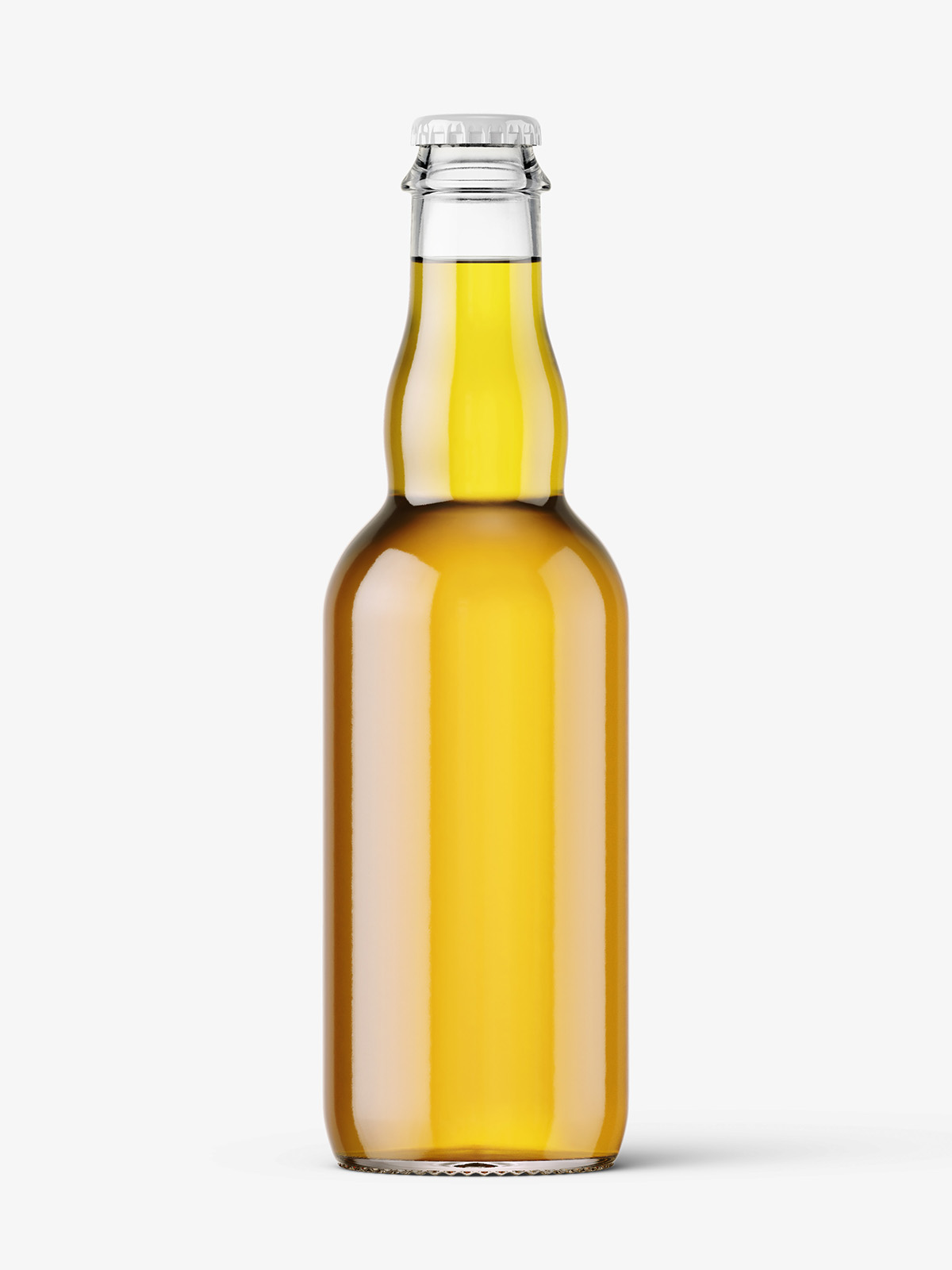 Transparent beer bottle mockup prepared to edit paper and metallic label. Every element has it’s own light layer that can be customized. Layer with waxed seal can be turn on and off.