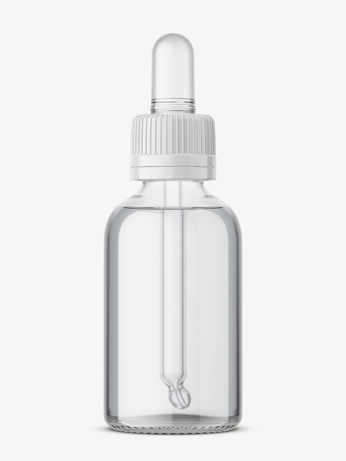 Transparent dropper bottle mockup filled with colorless liquid. It`s color can be changed as well as colors of the cap and dropper.