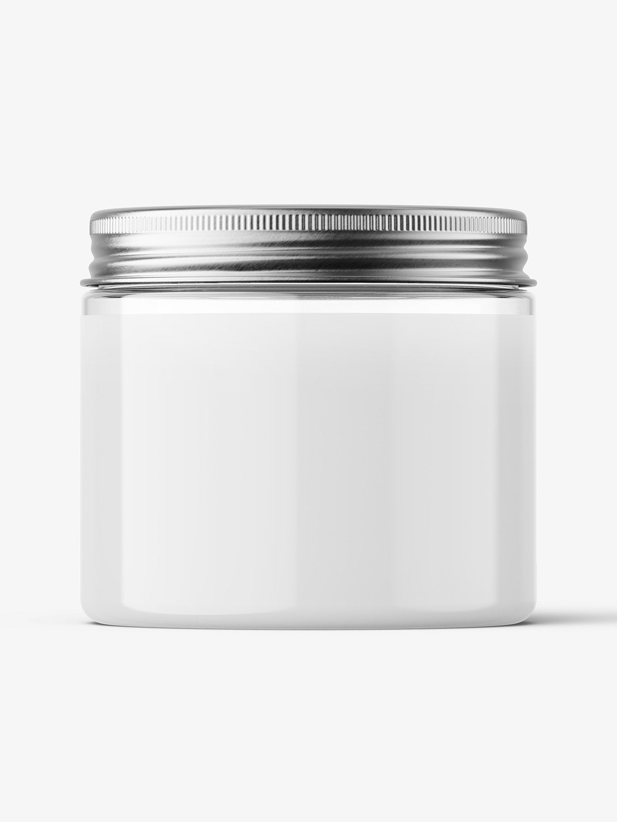 Transparent jar with metallic cap filled with cream mockup. Mockup is prepared in high resolution, you can change cream and cap color. Label covers entire jar.