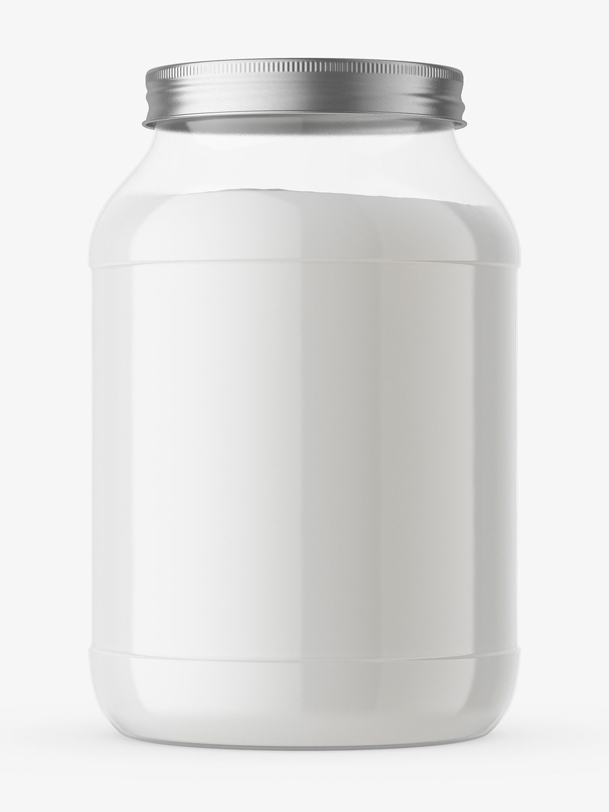 Transparent nutrition jar mockup filled with some powder. Such packaging is popular as a container for various sport products.