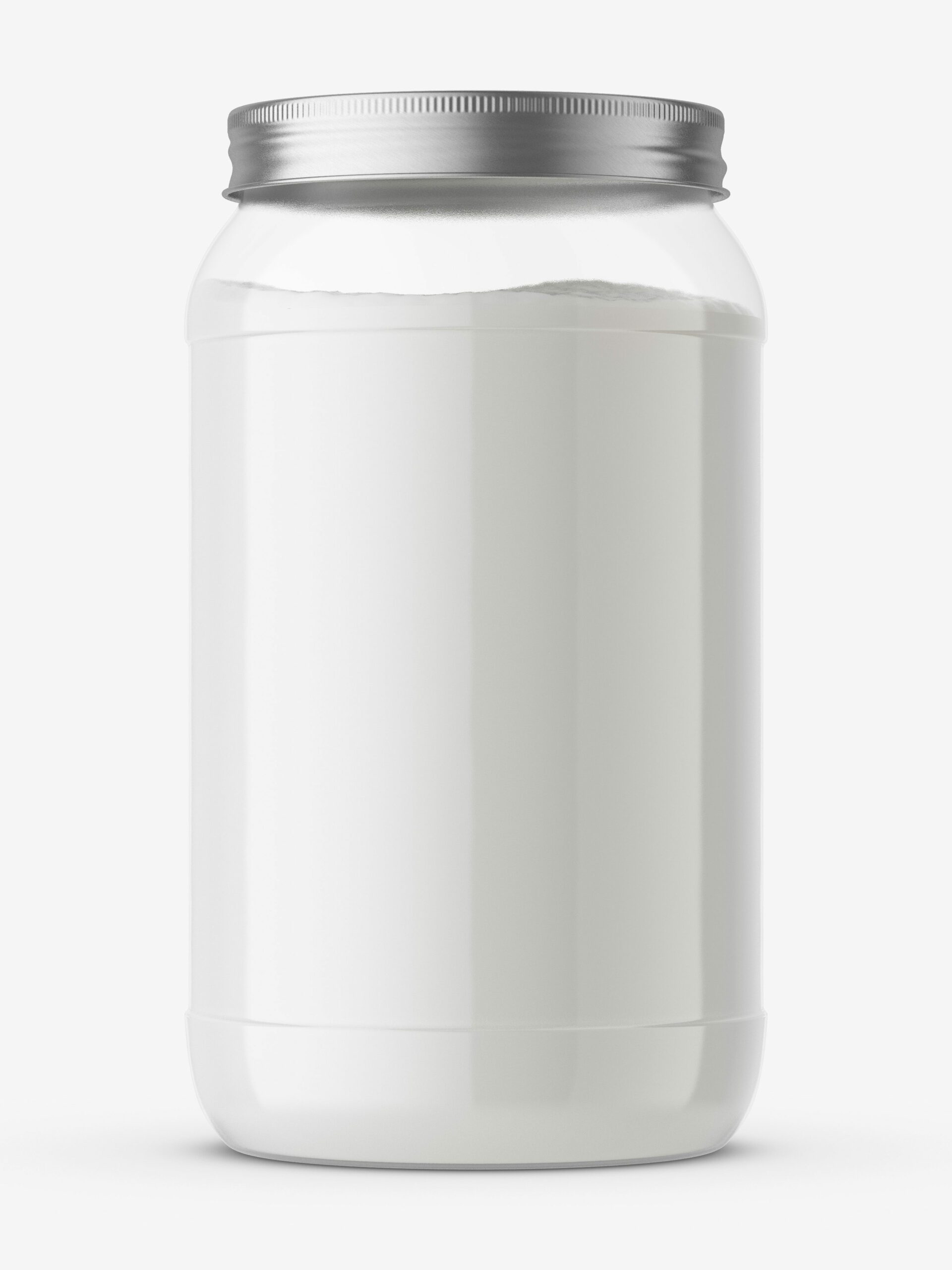 Transparent nutrition jar mockup filled with some powder. Such packaging is popular as a container for various sport products.