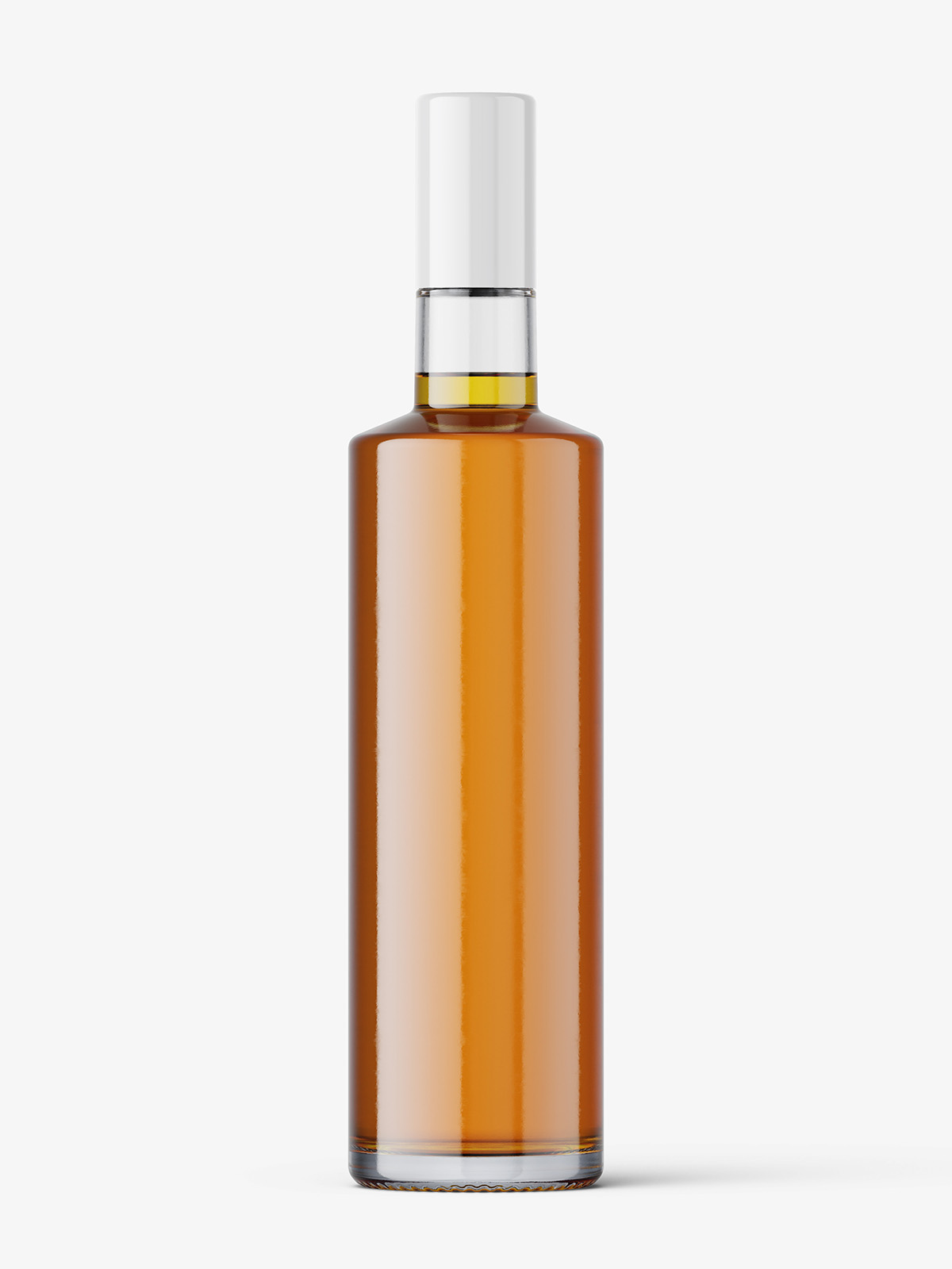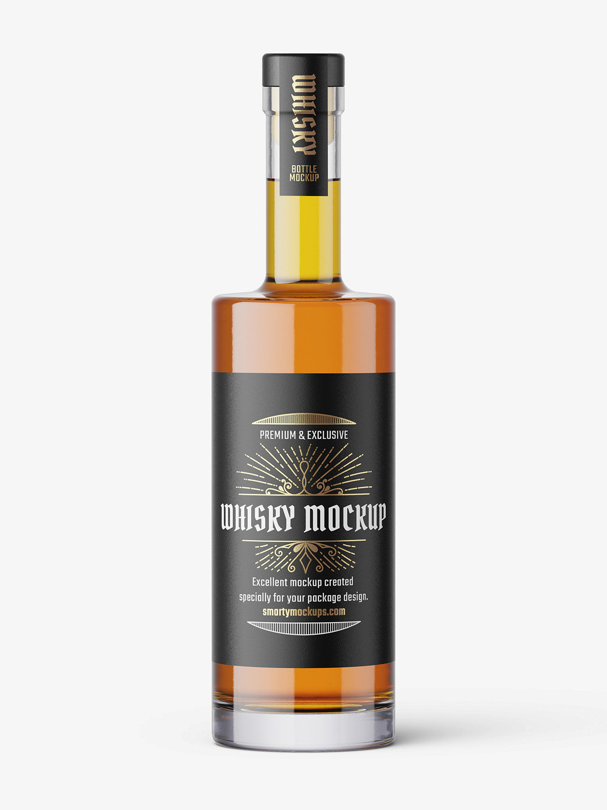 Universal whisky bottle with transparent liquid inside. Such mockup may be use as vodka packaging packshot or other alcohol drinks as well.